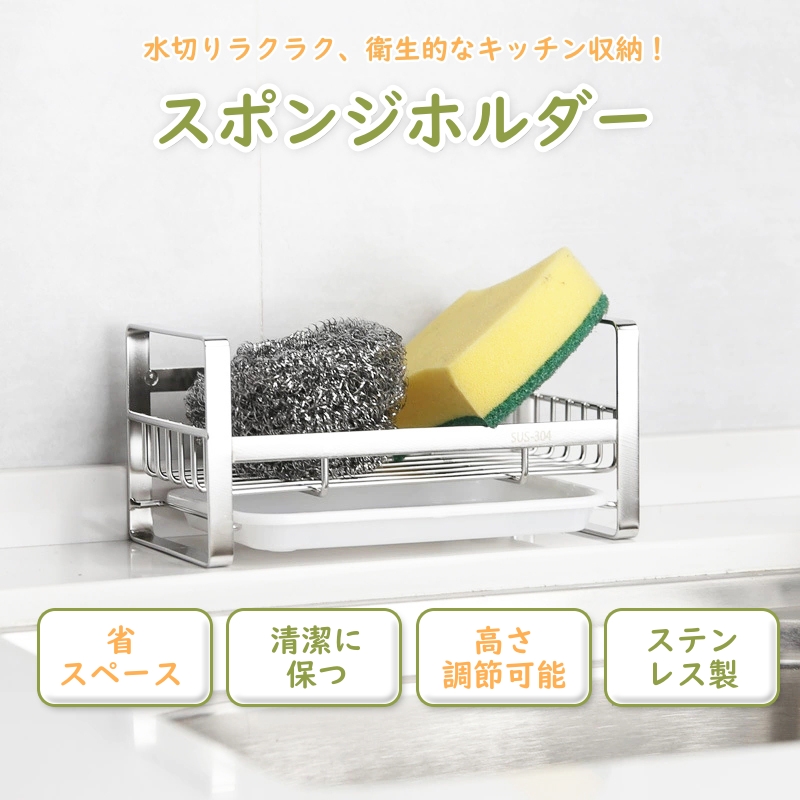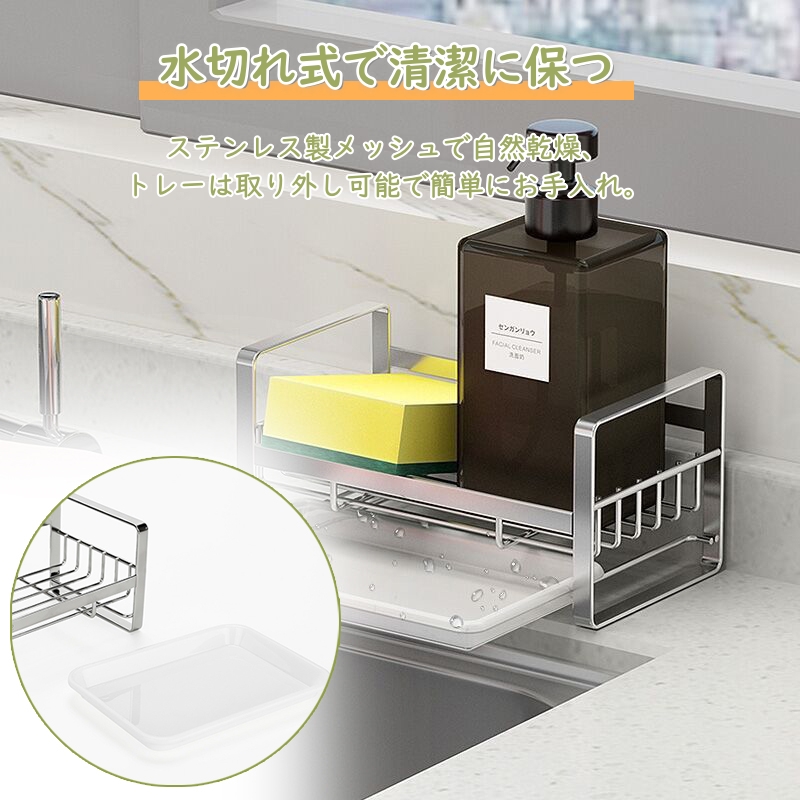 【水切れ式で清潔保持】ステンレス製メッシュ設計で水切れがよく、自然乾燥でスポンジを清潔に保ちます。取り外し可能な水切りトレーで、掃除も簡単。