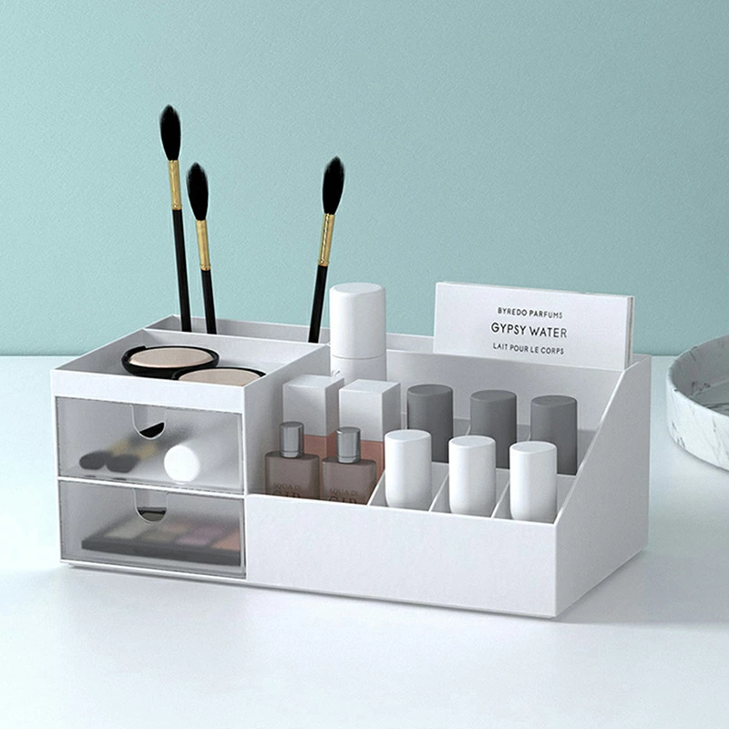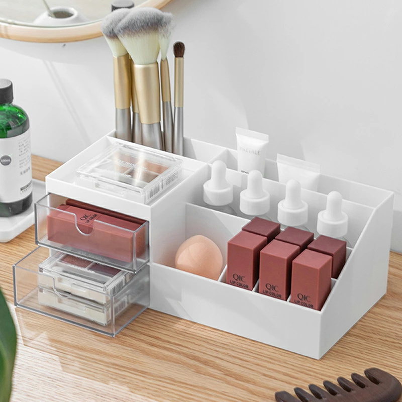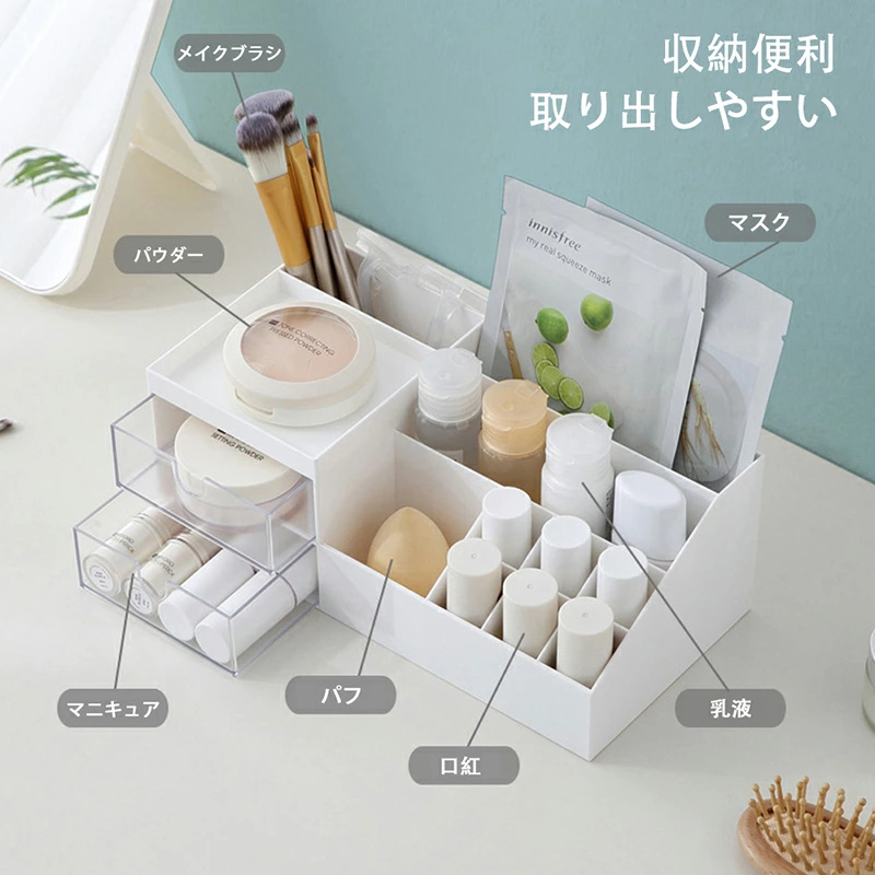| 【とても便利】 | 上には仕切りの設計で、取り出しやすし、頻?使用ものを整理整頓できます。下は透明な引き出しになっており、使用頻度が低く、丁寧に保管したいものを収納することができます。底面には滑り止めで、ずれたりにくい。 |