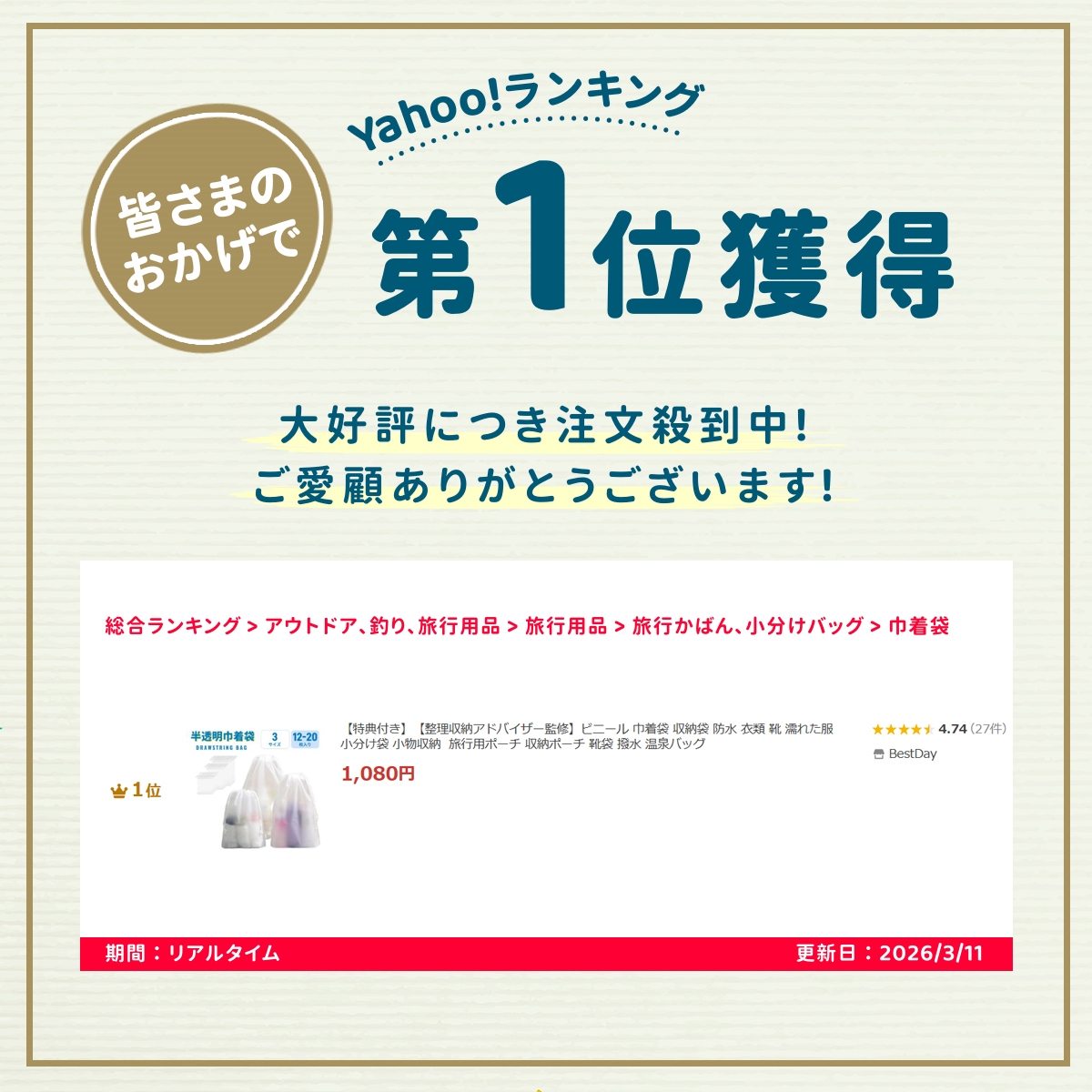 衣類や靴などを収納したいんですが、タンスの容量が足りない、そのまま置くと、ホコリが溜まってる!きんちゃく袋がその悩みを解決かもしれません。S、M、L三つサイズで小さい化粧品や上履きや運動着などを収納でき、きんちゃく袋の開け口を締めてヘッド下に収納していいではないですか。旅行の時にも、旅行用品を別々に収納してスーツケースは綺麗位になります。