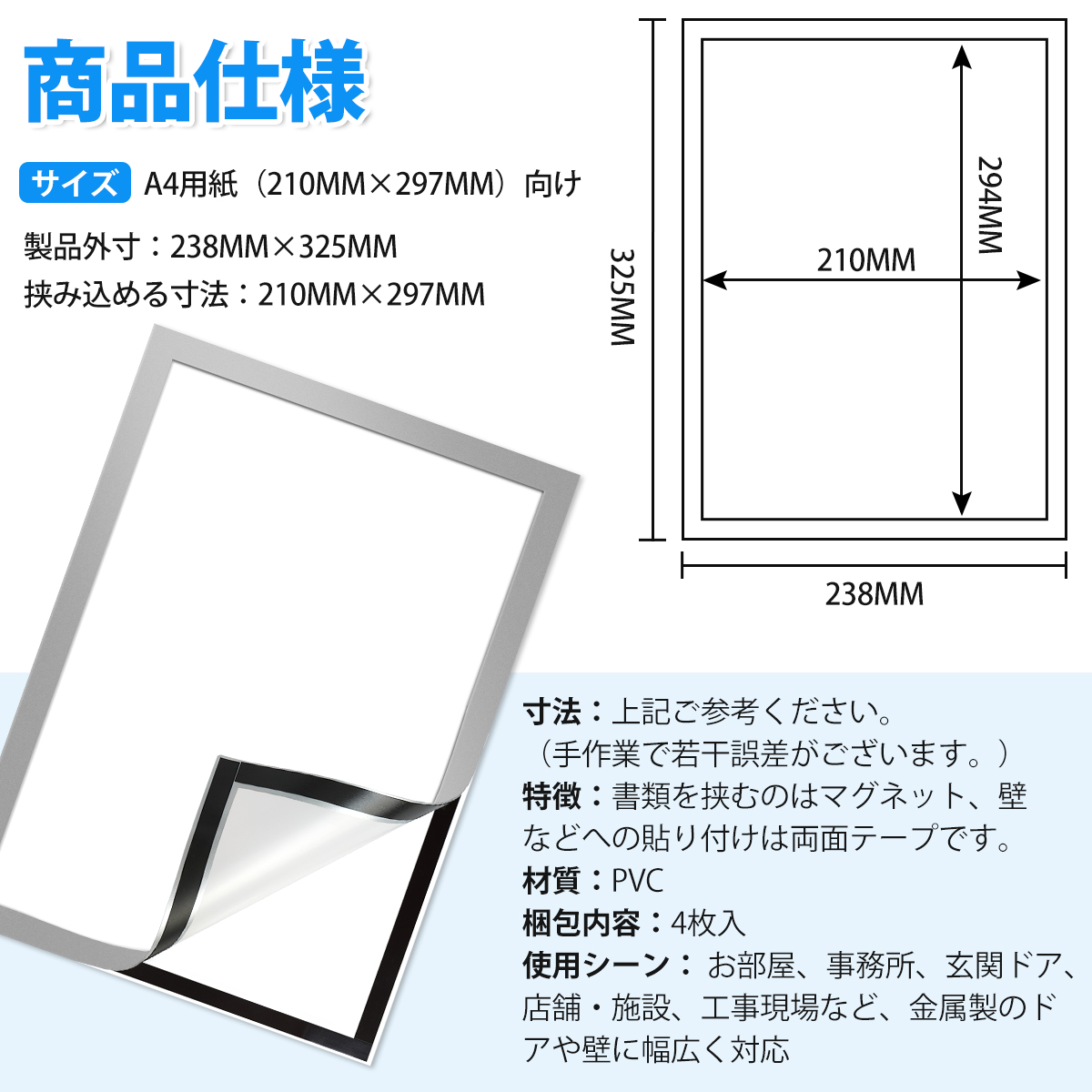 ・寸法:A4サイズ対応:外寸:238×325mm、内寸:210×297mm