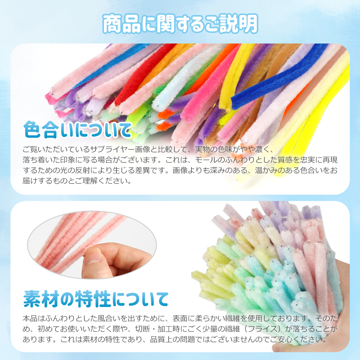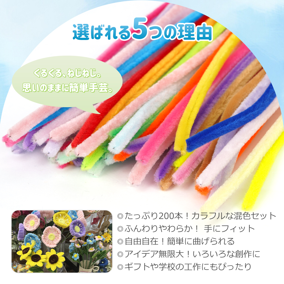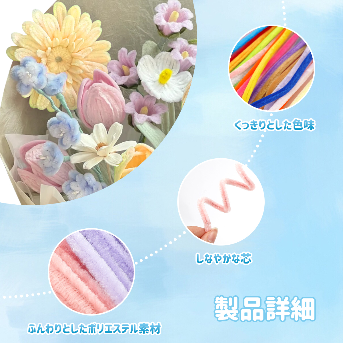 【ふわふわ手感! 可愛いビロード風素材】やさしい風合いのビロード風モールは、手に取りやすく、作品がより愛らしくなります。
