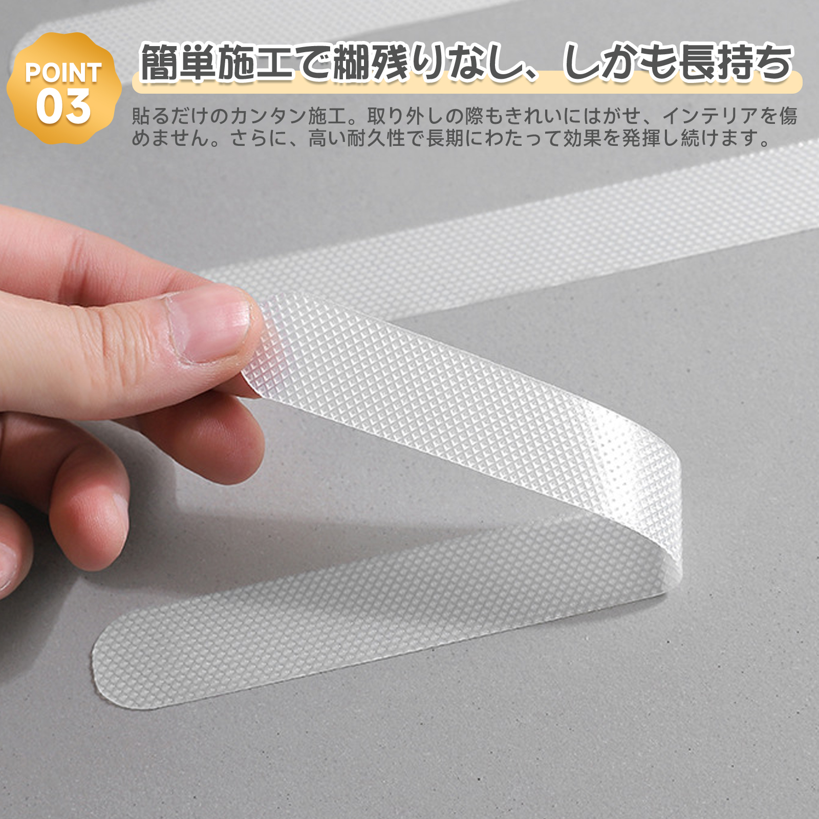剥がして貼るだけの簡単施工。取り外しの際もきれいにはがせ、インテリアを傷めません。さらに、高い耐久性で長期にわたって効果を発揮し続けます。24枚の大容量セットだから家中の滑りやすい場所にたっぷり使えます。 |