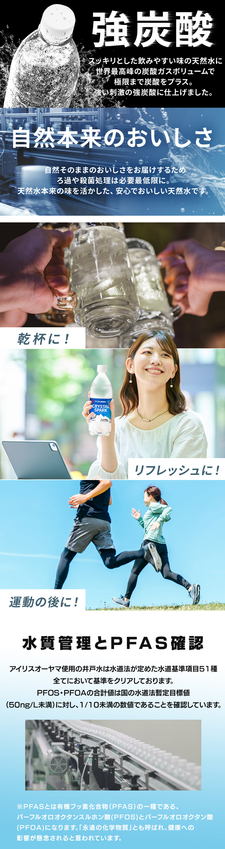 ボトルに閉じ込めた清らかで美しい天然水の輝きと炭酸のスパークで、心地よい刺激と爽快感が広がります。