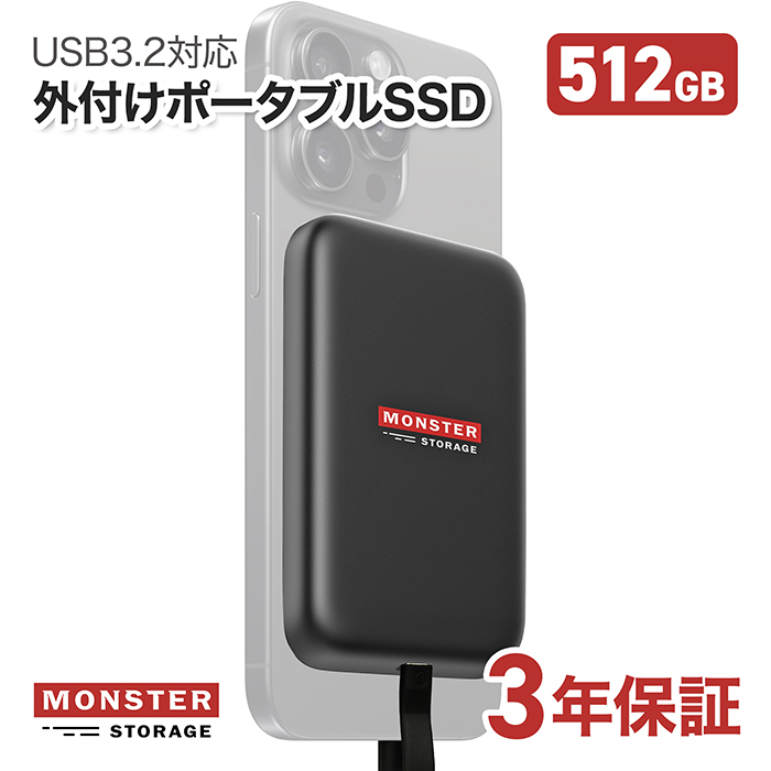 Monster Storage マグネット式 ポータブルSSD 512GB 1cmスリムボディー USB3.2 Gen2x2 Type-C 転送速度2,000MB/s Apple ProRes Log撮影対応 MS-PSD512G2LP
