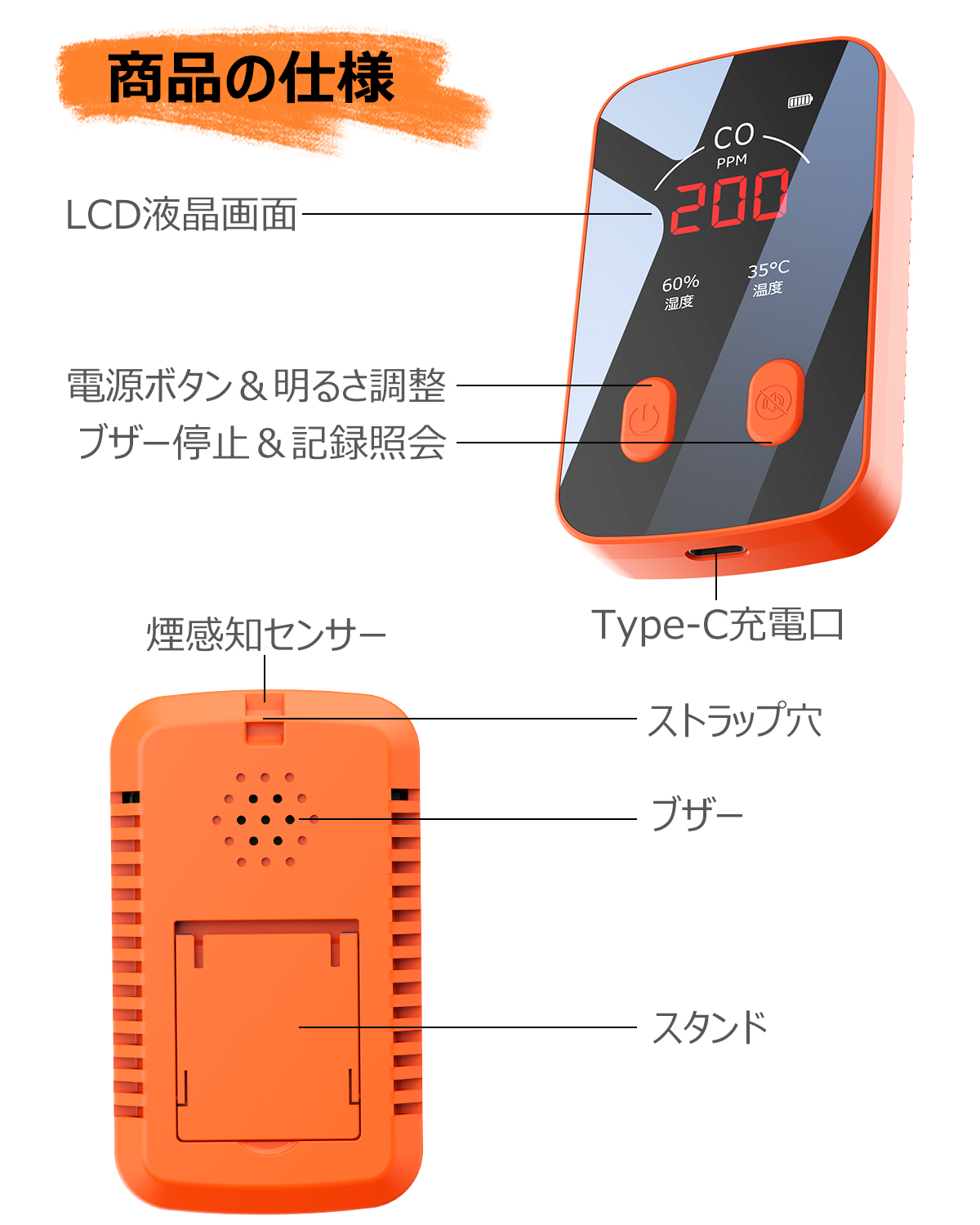 商品名:一酸化炭素チェッカー キャンプ 85dB大音量 デジタル表示 USB充電式 一酸化炭素警報器 携帯性 長持ちバッテリー キャンプ 車中泊 アウトドア 室内用 充電式 一酸化炭素チェッカ 携帯便利 max60時間連続使用 スタンド 一酸化炭素チェッカー ポータブル一酸化炭素チェッカー キャンプ用 一酸化炭素 Type-c充電式 アラーム 冬キャンプ用 湿度 温度 アラーム 小型 送料無料