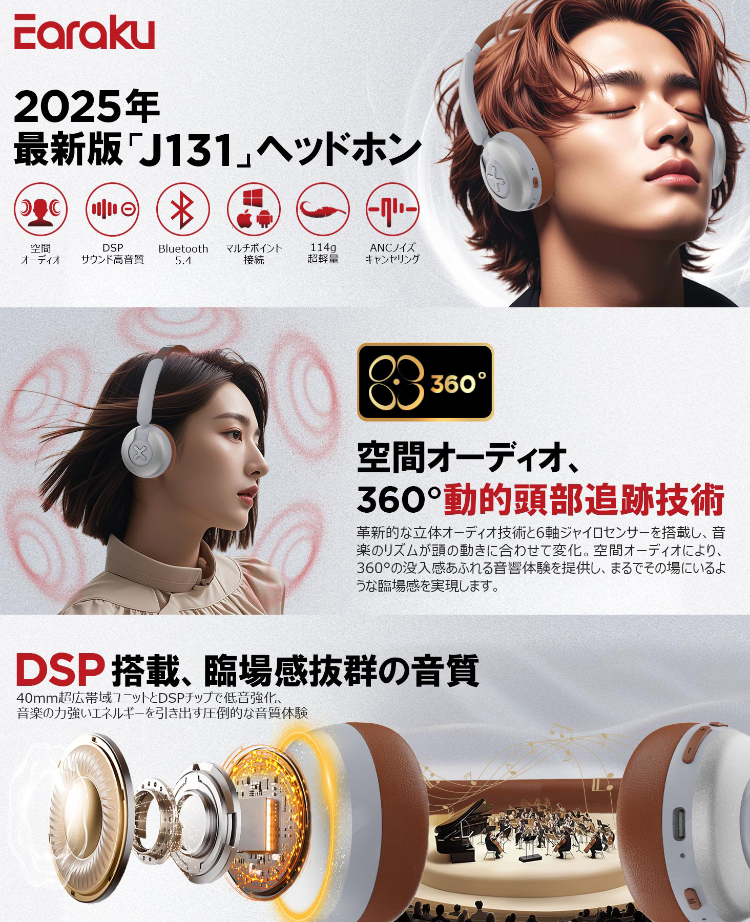 商品名:【2025年限界突破の空間オーディオ・ANCノイズキャンセリング】 ファッション ワイヤレス ヘッドホン 軽量 ワイヤレス ヘッドホンEaraku 軽量 ワイヤレスイヤホン 音漏れ無し ヘッドホン Bluetooth V5.4/マルチポイント接続 オーバーイヤーヘッドホン