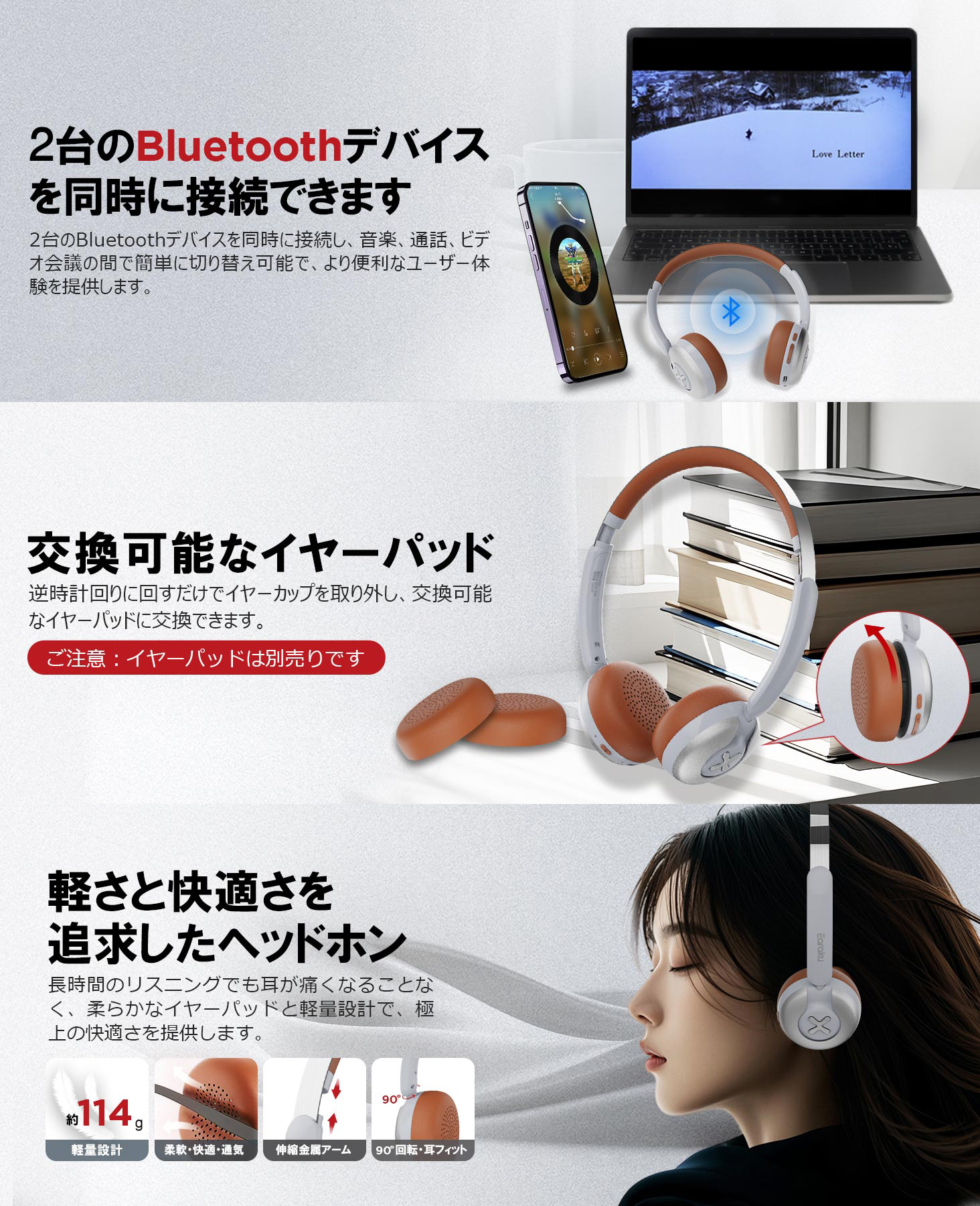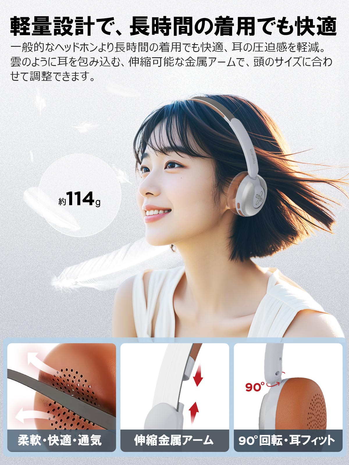【軽量で快適な装着感】このヘッドホンは、現代的で洗練されたデザインが特徴で、スタイリッシュさと快適さを兼ね備えています。柔らかなイヤーパッドが耳を優しく包み、ヘッドバンドは圧力を均等に分散させることで、長時間の使用でも快適さを保ちます。精緻な金属製アームと調整可能なデザインにより、さまざまな頭の形にぴったりフィットします。さらに、ヘッドホンはわずか114gの軽量設計で、オフィスワーク、映画鑑賞、電車通勤など、あらゆるシーンで快適に使用できます。