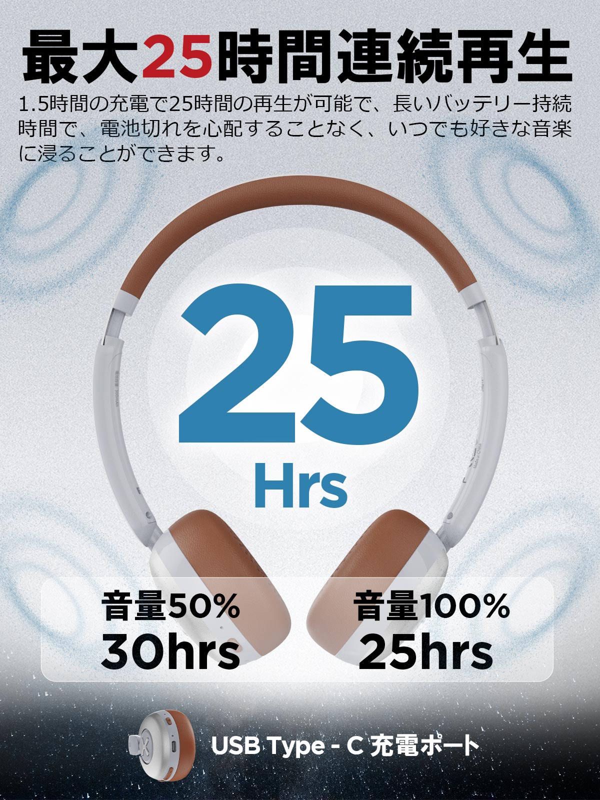 【長時間再生対応】Earakuワイヤレスヘッドホンは、1回の充電で最大25時間の音楽再生が可能(イマーシブオーディオモードで最大30時間)。Type-C充電により、わずか1.5時間でフル充電が完了します。映画や音楽を没入感たっぷりに楽しみながら、仕事の合間にリラックスする時間も音声が途切れる心配なく、快適に使用できます。高音質で長時間の使用が可能なため、通勤や旅行にも最適なヘッドホンです。