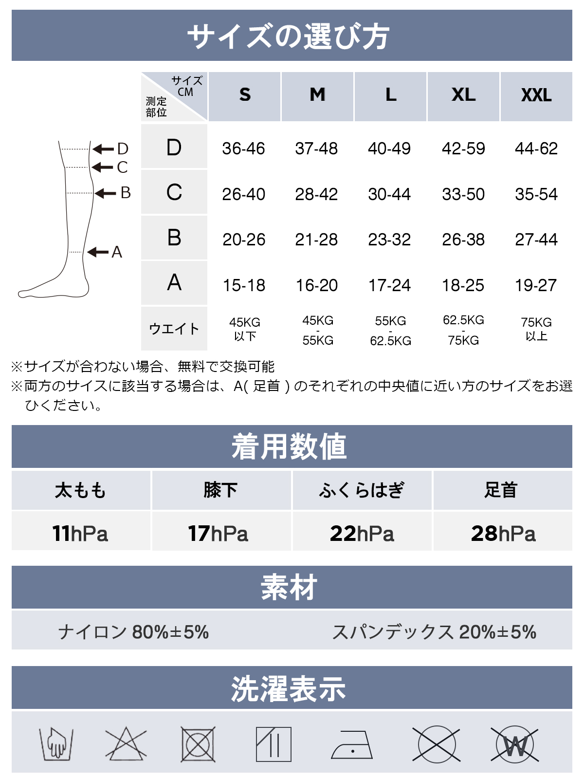 ●足首26hPa、ふくらはぎ20hPa段階圧力設計。快適な圧力値でむくみをやわらげます。