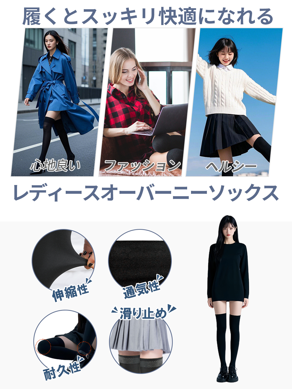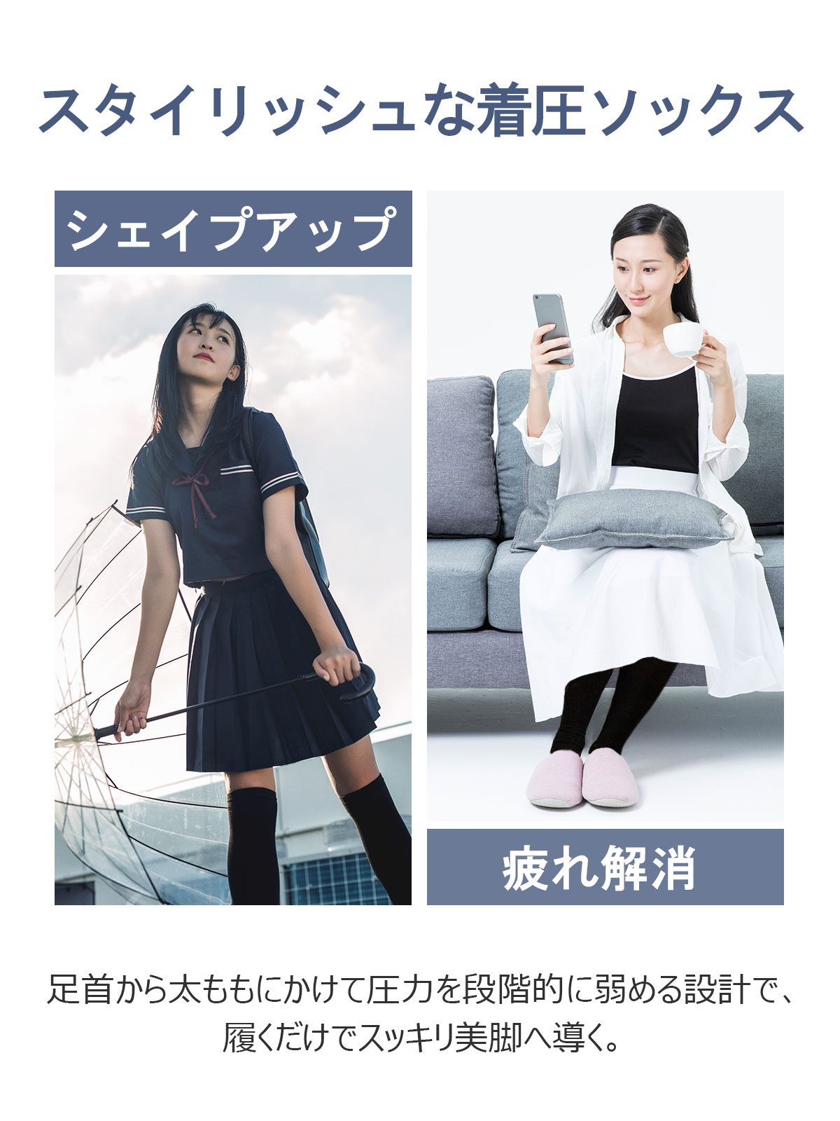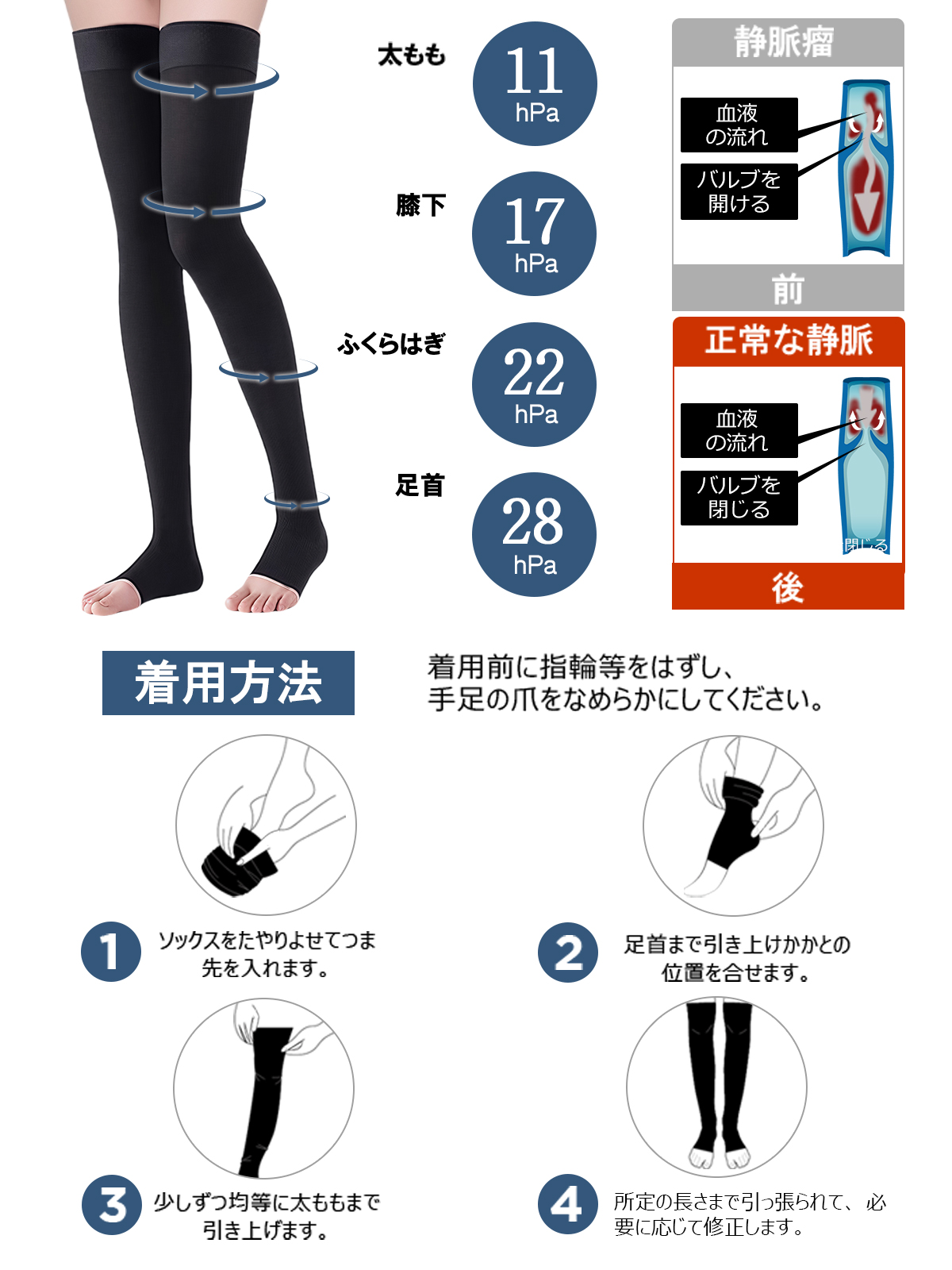 【段階圧力設計・むくみスッキリ】足首からふくらはぎにかけて段階的に圧力が異なるデザインは、血流をスムーズに保ちます。これにより、日常的なむくみを軽減し、脚の疲れを和らげます。立ちっぱなしや座りっぱなしの方に特におすすめです。