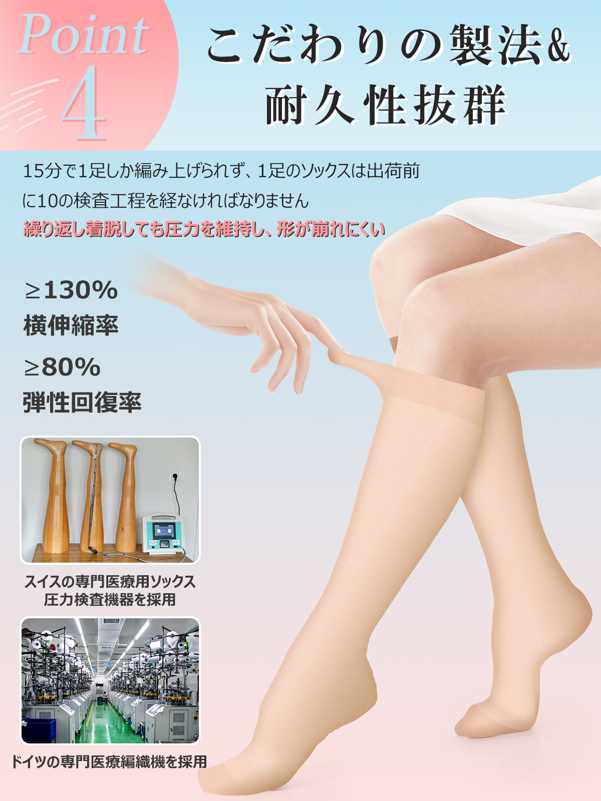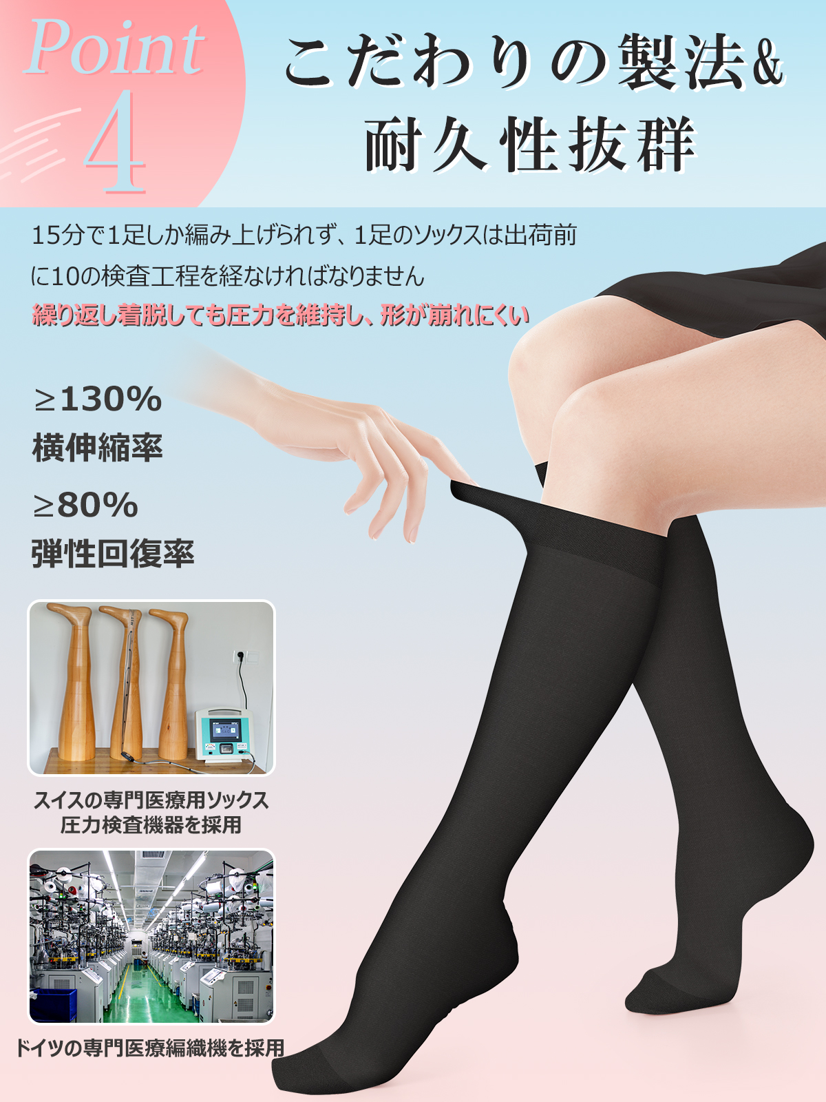 ●「メッシュ編み」+「リブ編み」の編み分け設計で、脚の動きを妨げずにサポート。