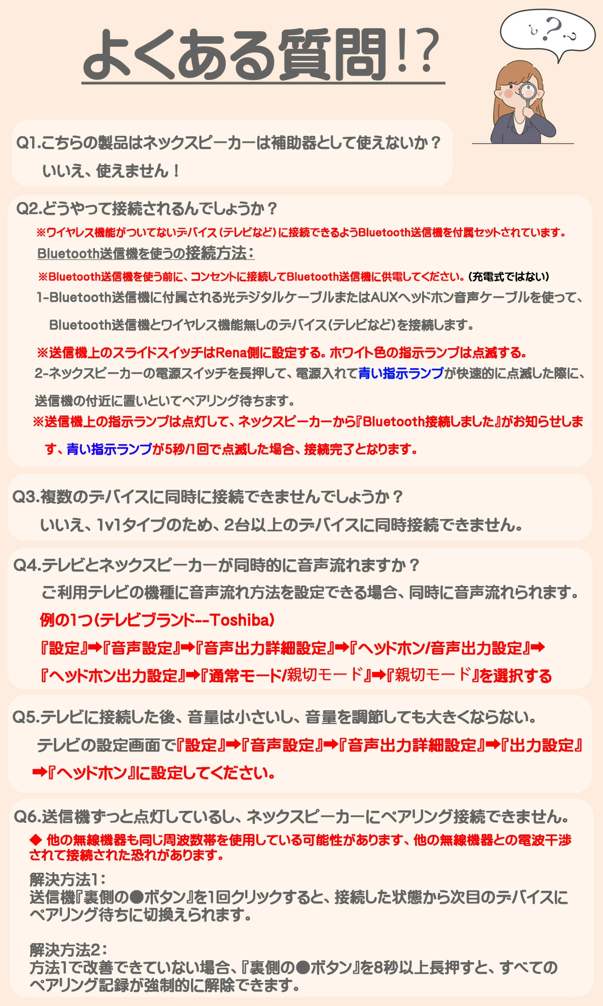 よくお読みください。↓↓↓テレビと接続する方法:★スピーカー本体の音声調整ボタンをゆっくりクリックして、音量が調整できます。どうぞご了承ください。一.Bluetooth対応テレビと接続する方法:1.ネックスピーカーの電源を入れます。