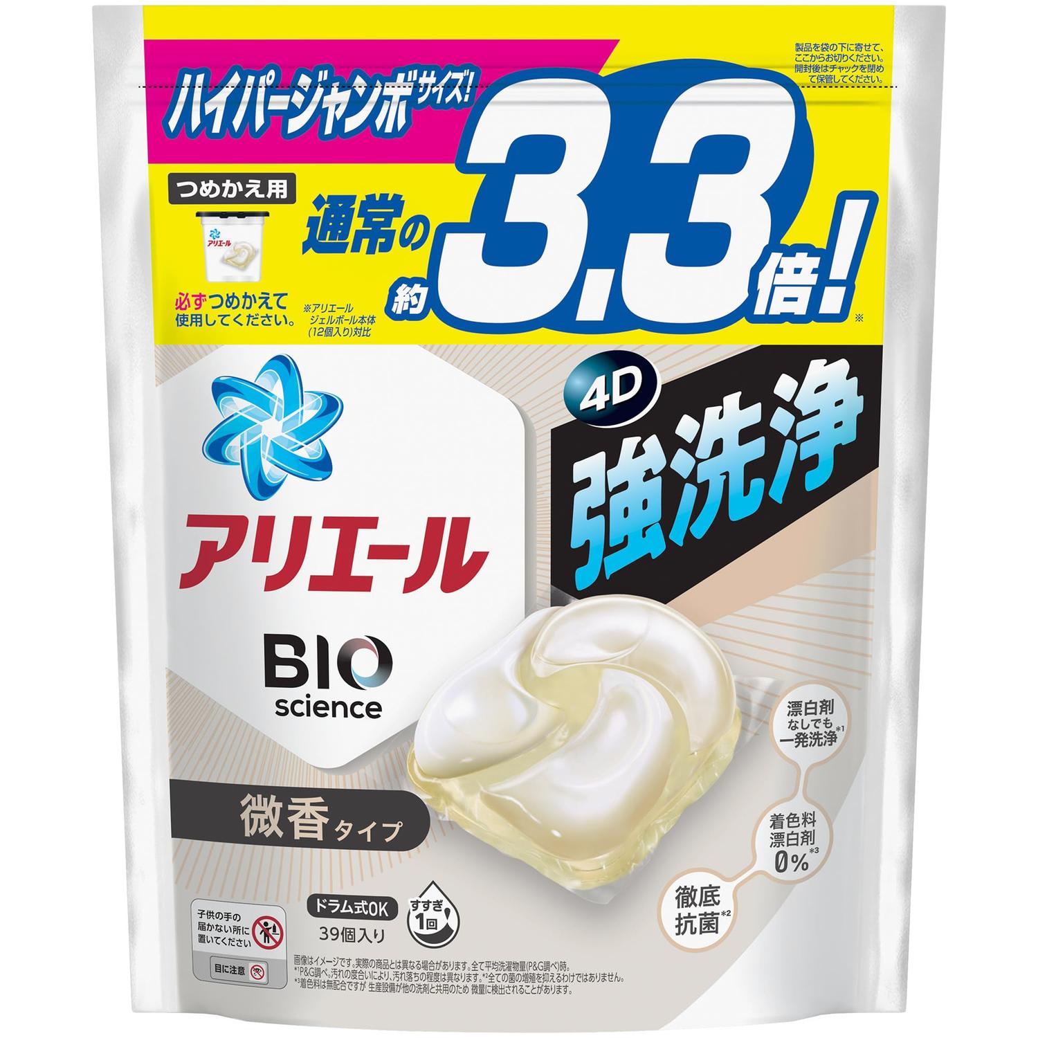 ■成分:界面活性剤(66%:直鎖アルキルベンゼンスルホン酸塩、アルキルエーテル硫酸エステル塩、ポリオキシエチレンアルキルエーテル、純せっけん分(脂肪酸塩))、安定化剤(プロピレングリコール)、分散剤、金属封鎖剤、水軟化剤、酵素、蛍光増白剤