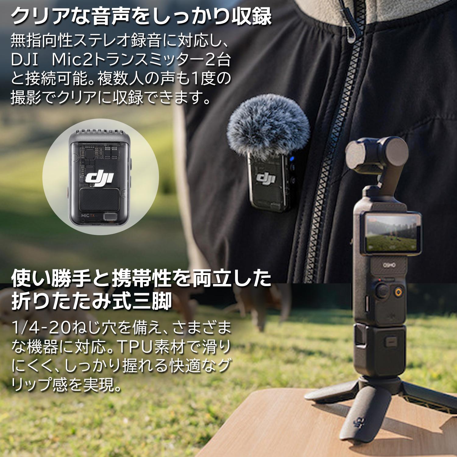 音声収録面では、無指向性ステレオ録音に加え、付属のDJI Mic 2トランスミッターを使用することで、よりクリアな音声収録が可能です。映像だけでなく、音にもこだわりたい方におすすめのセット内容です。