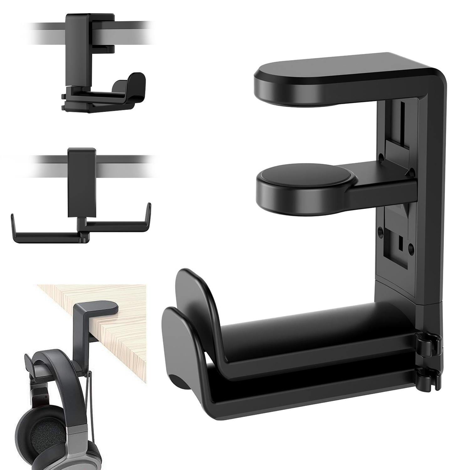 ヘッドホンスタンド 2台同時掛け 360°回転式 ダブルフック バネ式クランプ式 ヘッドホンハンガー デスク取付け ブラック ((S