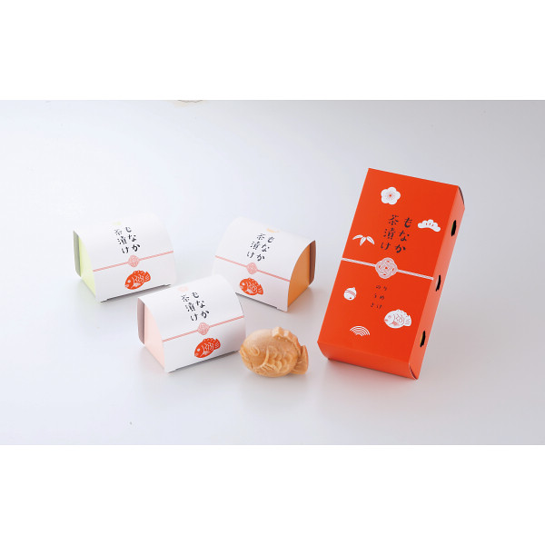 ふっくら可愛い鯛型もなかで3種類のお茶漬けを包みました。もなかの皮はモチモチ食感で食べ応え抜群です。