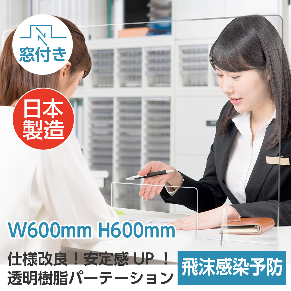 【対象】【T型角丸】W300窓付き スタンド付き W600xH600mm 透明樹脂パーテーション 日本国産材料使用 衝突防止 飲食店 飛沫感染防止 仕切板 pep-r6060m爆買