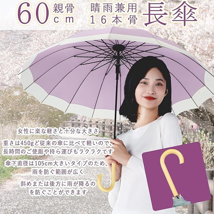 傘 レディース 長傘 おしゃれ 傘 メンズ 大きい 16本骨 親骨60cm 雨傘 日傘 ワンタッチ 【晴雨兼用・ 遮光遮熱】 紫高強度ガラス繊維 台風対応 自動開 梅雨対策