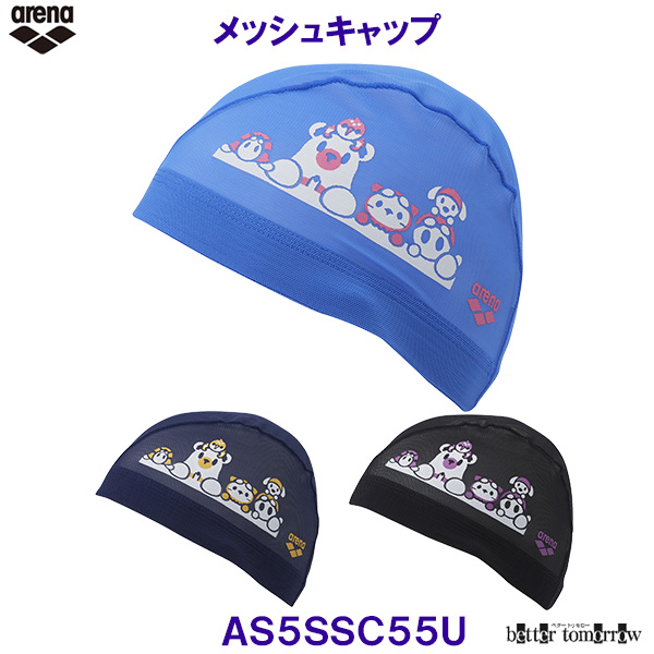 ■アリーナくんと仲間たちが仲良く並んでこちらを覗いているイメージを可愛らしくデザインにしたメッシュ素材のスイムキャップです。arenaロゴが着用者の左側になるように着用。