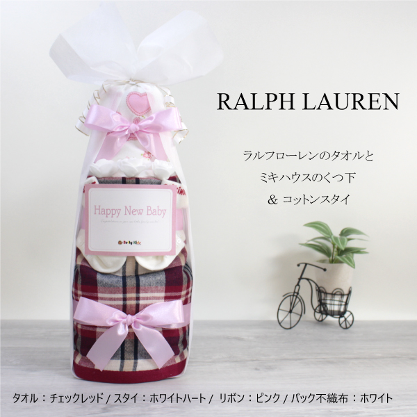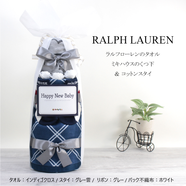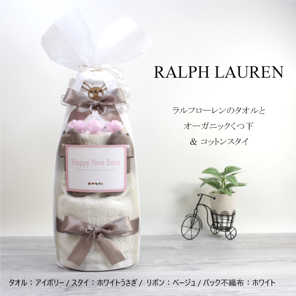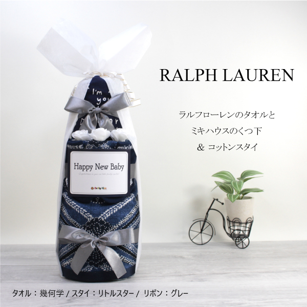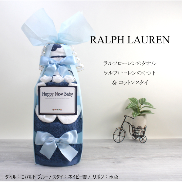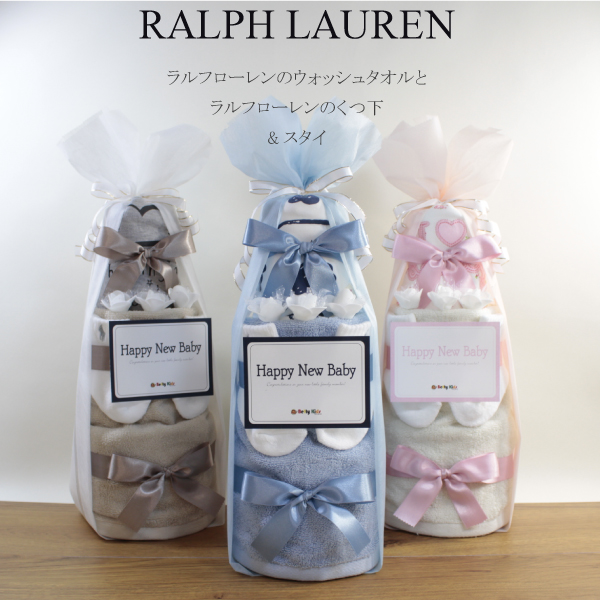 | ★ラルフローレンのウォッシュタオルとラルフローレンorミキハウス等のくつ下、そしてコットンスタイとパンパースで作った豪華3段オムツケーキの登場です!すべてコットン100%でとっても肌さわりがいいです! | ||