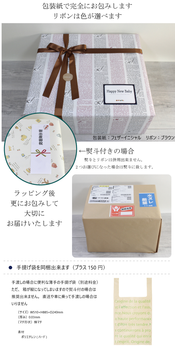 | 新生児サイズのご注文はこちらへ Mサイズのご注文はこちらへ 【発送について】銀行・郵便・コンビニ等の振込みの場合はお振込みを頂いた時がご注文時になります。 ◎出産お祝いに大変喜ばれるワンクラス上のパンパース はじめての肌へのいちばんシリーズSサイズ66枚入りを2袋(合計132枚)を包装紙で完全にお包みし、熨斗やリボンでラッピングしお届け致します。 ◎内容:パンパース " はじめての肌へのいちばんシリーズ" (男女共用) サイズ:Sサイズ(4kg〜8kg) 枚数:66枚入りを2袋(合計132枚) 追加出来るもの:手提げ袋(縦になってしまうのでリボン包装の場合のみ追加してください 最高級の素材で作った、極上の肌心地のおむつ 細い繊維の層と太い繊維の層の両方の組み合わせた「ダブルレイヤー構造」の採用で、なめらかさとふかふかさの両方を実現。うまれたての肌にやさしく、摩擦を軽減。 無配合のやさしさ お子さまの繊細の肌のために 香料・パラベン・ラテックス無配合。おむつかぶれから守ります。 トップシートにローション配合。シアバター入り。 360°雲ごこち通気システム 10,000個の通気孔で新鮮な空気を通し続け、ムレを防いでお肌快適。 360°モレ防止システム 「背中モレキャッチャー」の新採用でゆるうんちやおしっこをせき止めます。元気に動いても、モレ0を実現! シンプルで飽きのこないデザイン かわいいキャラクターたちでママと赤ちゃんの会話のきっかけを作ります。 ※銀行振込みの場合はお振込みを頂いた時がご注文時になりますのでお届けは通常より日数がかかります。 東京から発送致しますので本州以外は2日かかります。 ※手渡しの場合に便利な薄手の手提げ袋(+150円)は箱が縦になってしまいますので熨斗付の場合は推奨出来ません。直送や車に乗って手渡しの場合はいりません ※リボンと熨斗は併用できません。2つお選びになった場合は熨斗を付けてお届けさせて頂きます。 ※オリジナルメッセージをご希望の場合は [ギフト・のし設定]→ギフトメッセージ にご記入下さい(ギフト包装の種類 は指定なし で) ※おむつは衛生上返品・交換は出来ません。 【注意】送付先が北海道・九州・四国は550円(税込)沖縄は2500円(税込)の送料が別途かかります。(当店も送料は負担しております) |