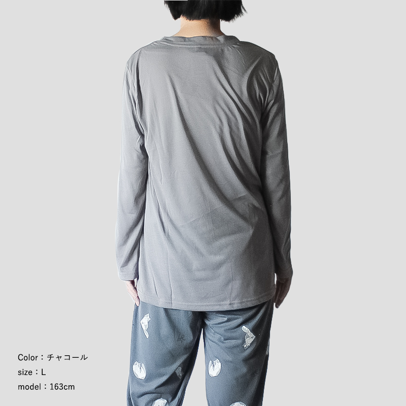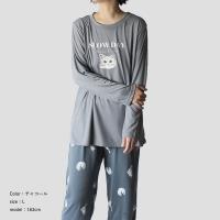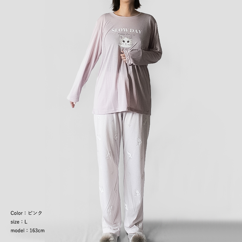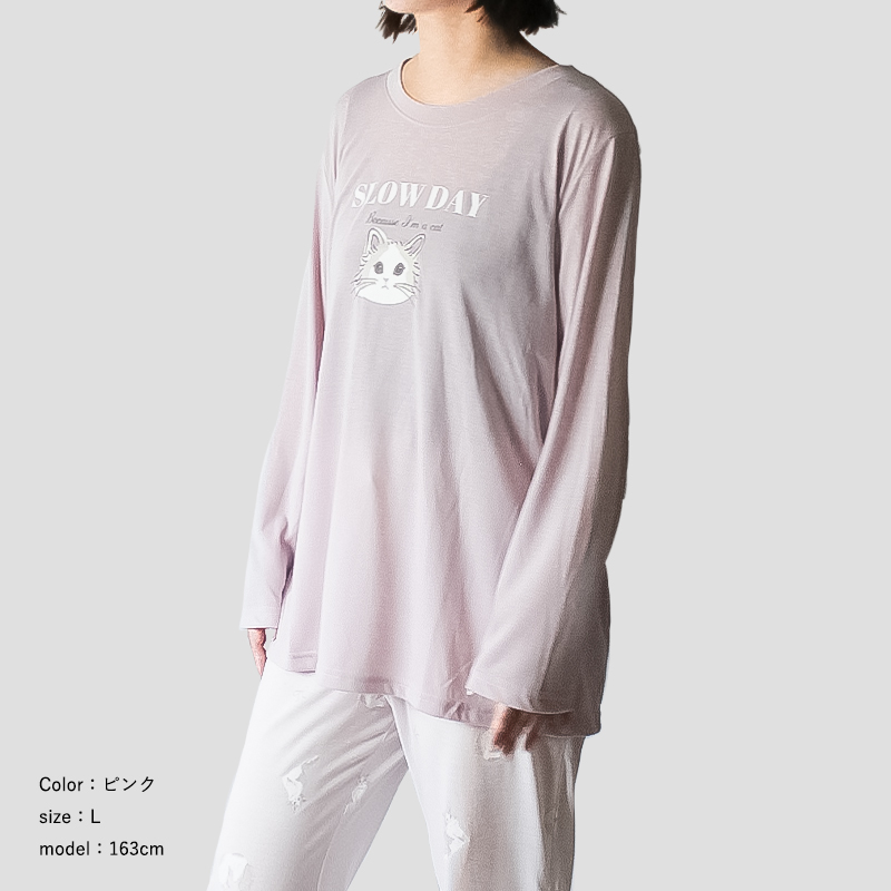 かわいい猫ちゃんのプリントが施された薄手のロングTシャツと、猫ちゃんの総柄パンツのルームウェアセットです。
