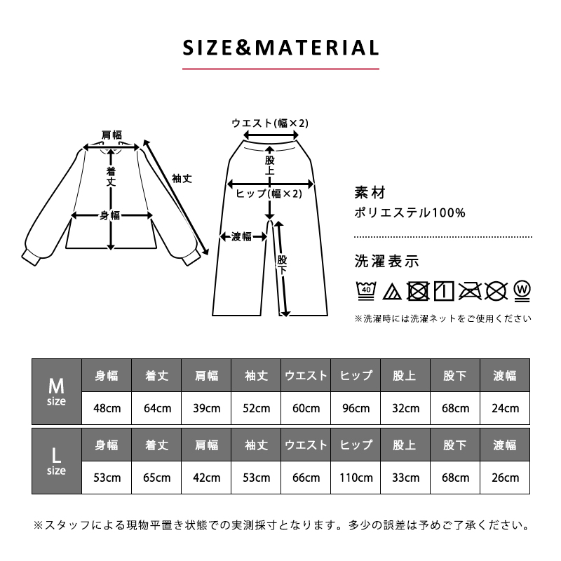 ボトムス:ウエスト66cm、ヒップ110cm、股上33cm、股下68cm、渡り幅26cm