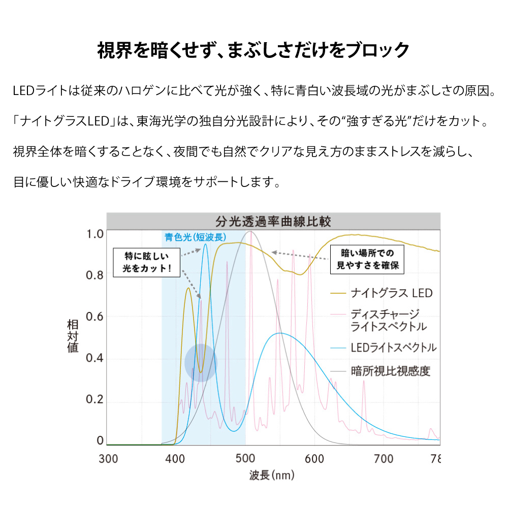 東海光学独自の特許技術で、LEDライトの強い光だけをピンポイントで軽減。