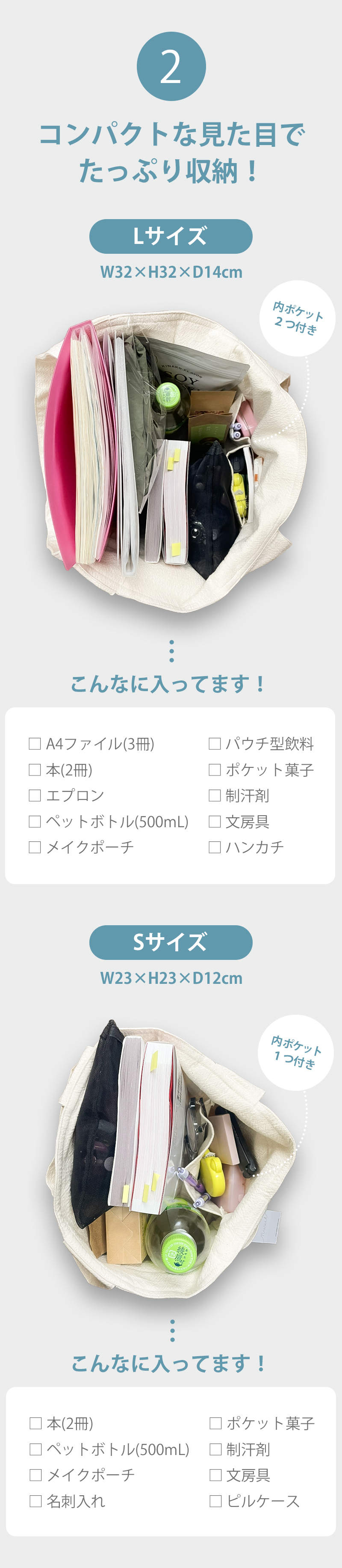 お弁当、長財布、500mlボトル、化粧ポーチなど、日常のお出かけに必要なアイテムがしっかり収まります。