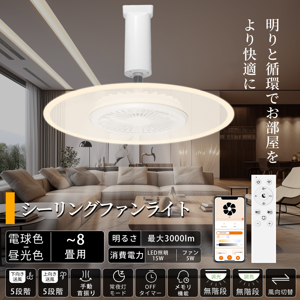 専用のリモコンとスマートフォンアプリで、簡単に調光調色風速の調整が可能です。お好みに合わせて、室内の照明を簡単に調整でき、温かみのある光からクールな光まで、シーンに応じた最適な明るさと色温を実現します。さらに、風速も無段階で調整でき、心地よい風をお好みの強さに合わせて設定できます。