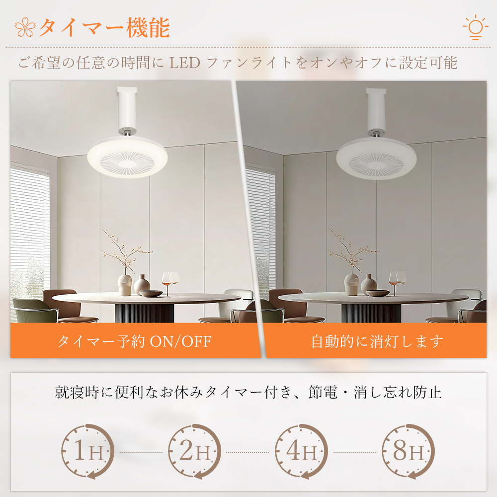 ファンのタイマー機能は、就寝前や外出前の設定に便利で、消し忘れを防ぎます。寝た後に自動消灯を実現できます。睡眠質上がり、電気代も節約できます。
