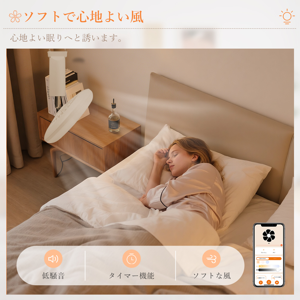 専用リモコンとスマホアプリは同一機能に対応しており、照明のON/OFF、調光・調色、ファンの風量調整、タイマー設定まで、どちらからでも操作可能です。使用シーンや好みに応じて操作方法を選べるため、世代を問わず快適にご使用いただけます。