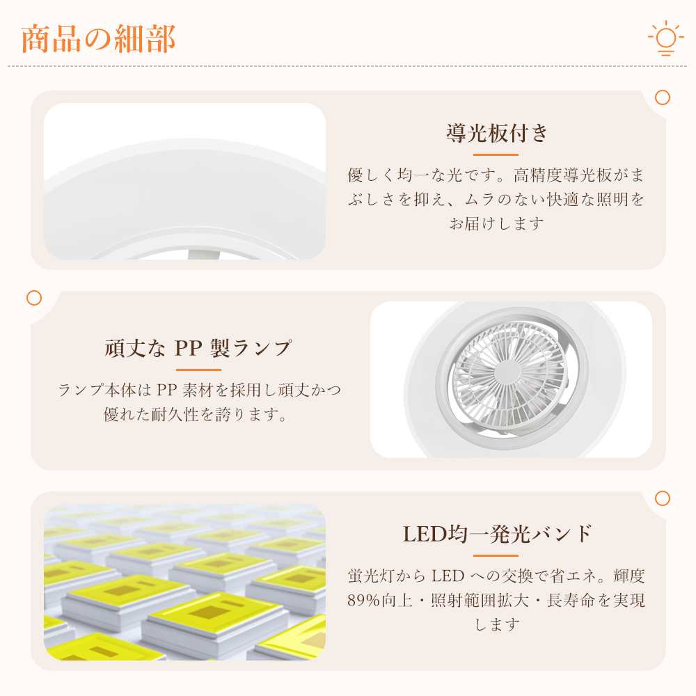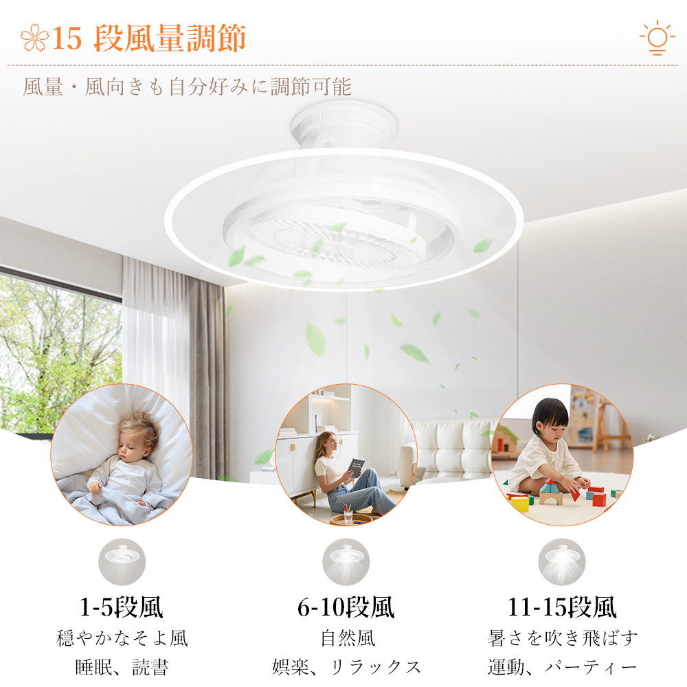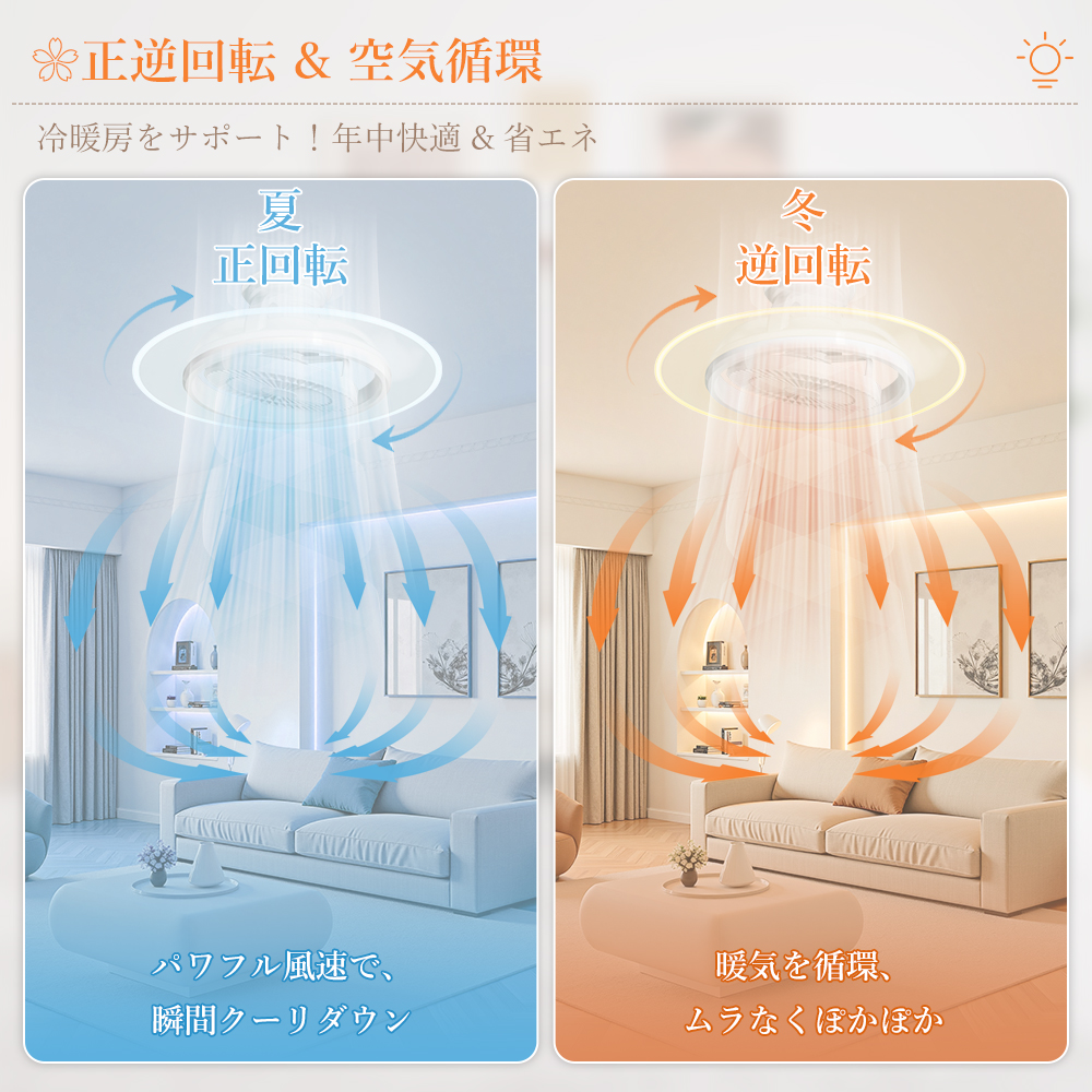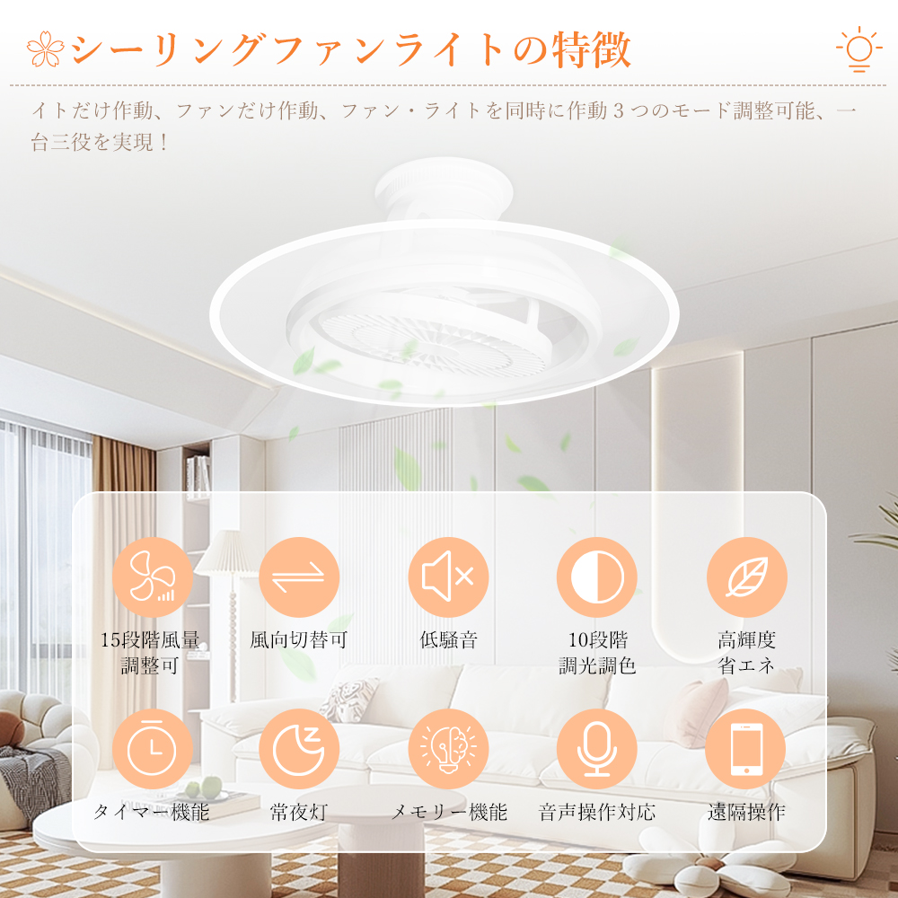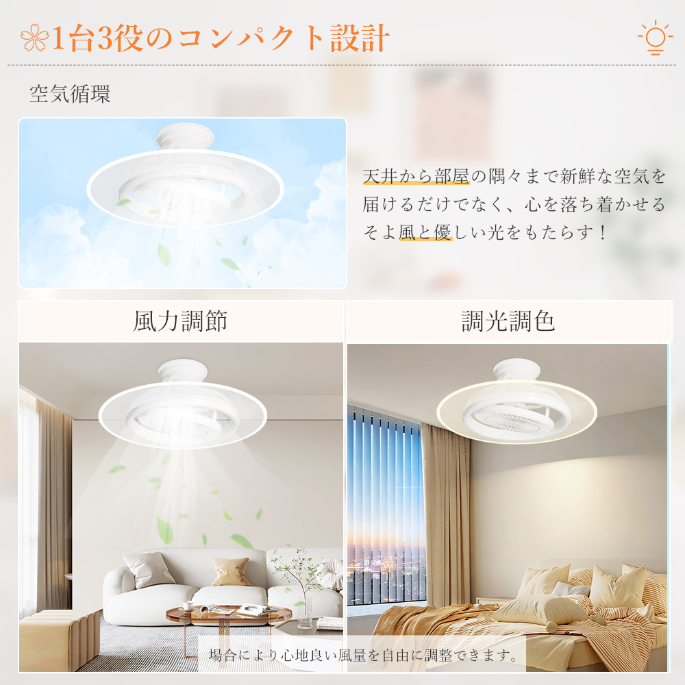 LED シーリングファンライトはファンと照明を一体化し、ライト単独 / ファン単独 / 両方同時作動の 3 モードに対応し、空気循環を促進・温度差を解消し、部屋の隅々まで優しい光とそよ風を届けて快適な空間を演出します。