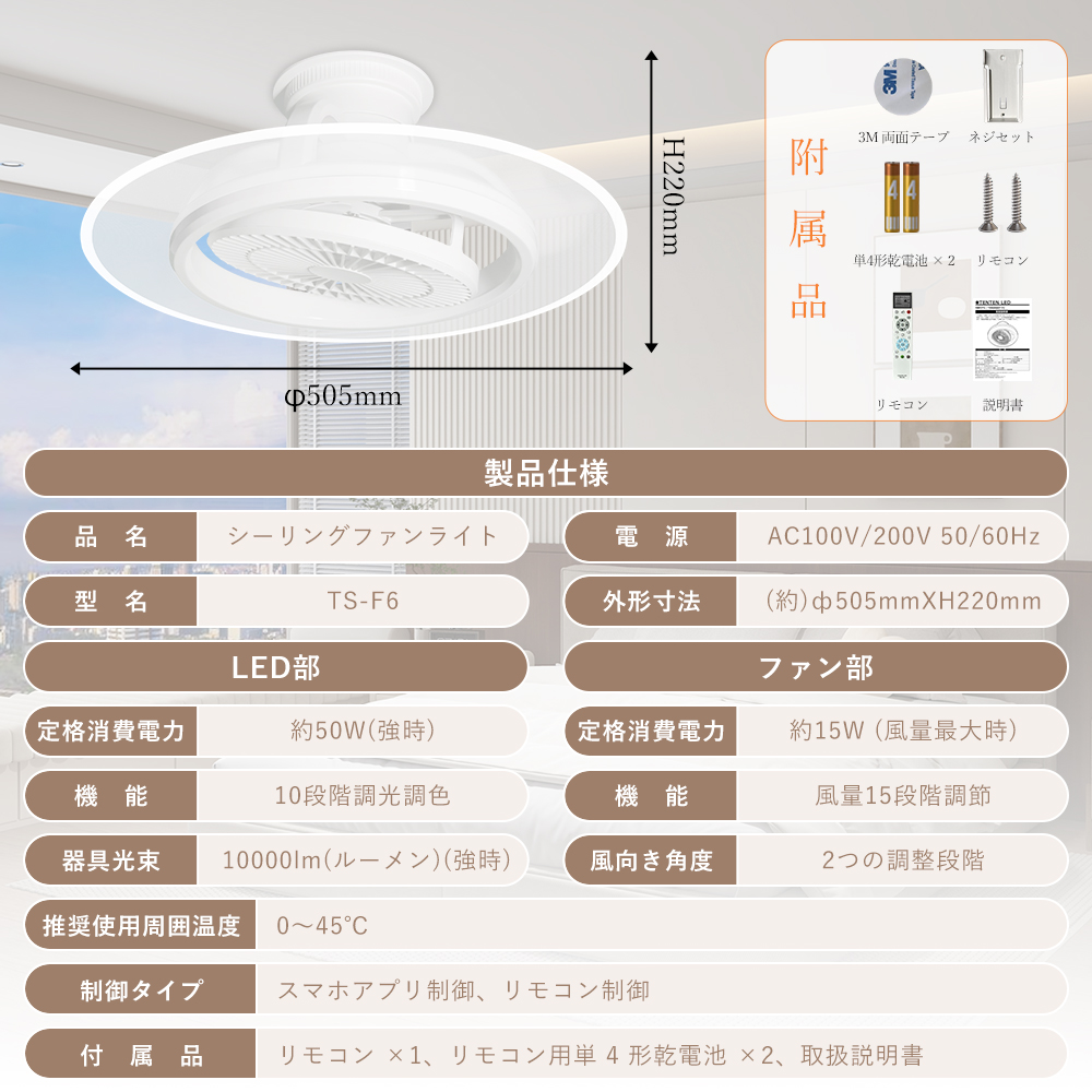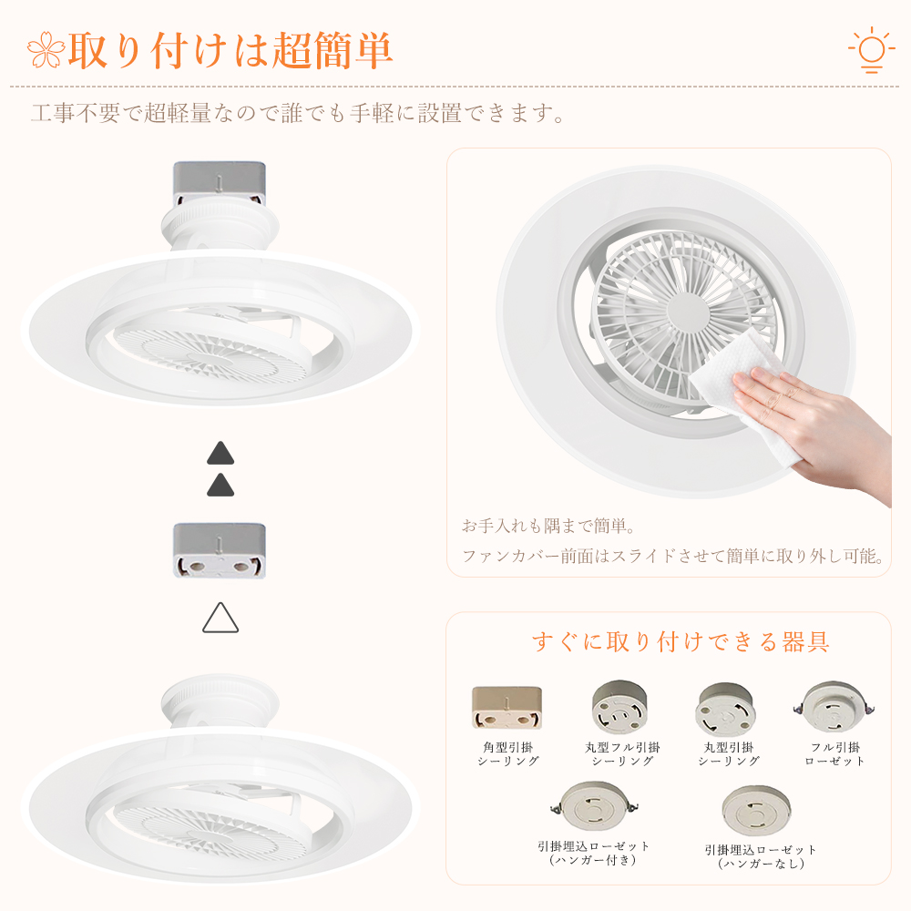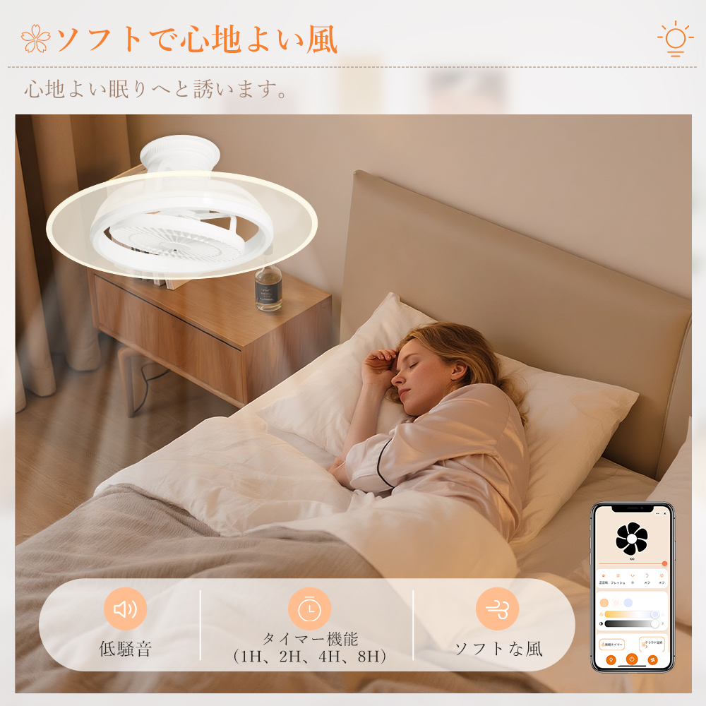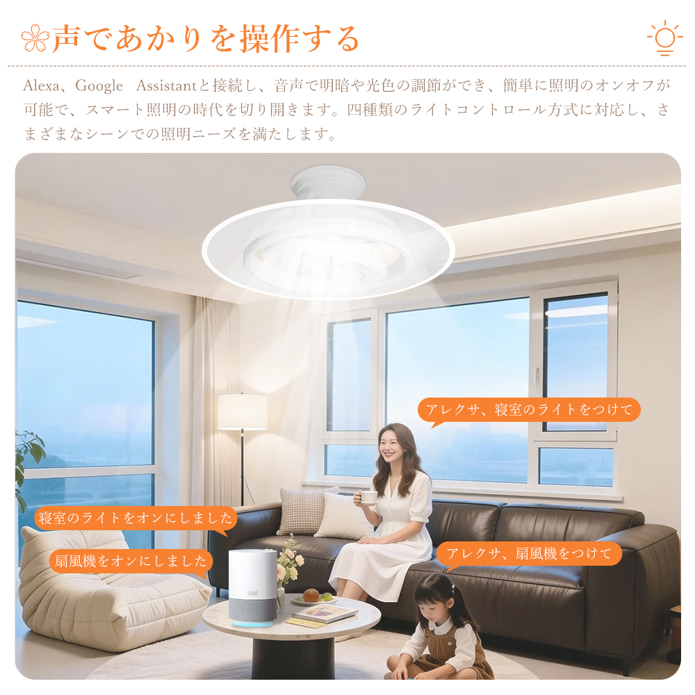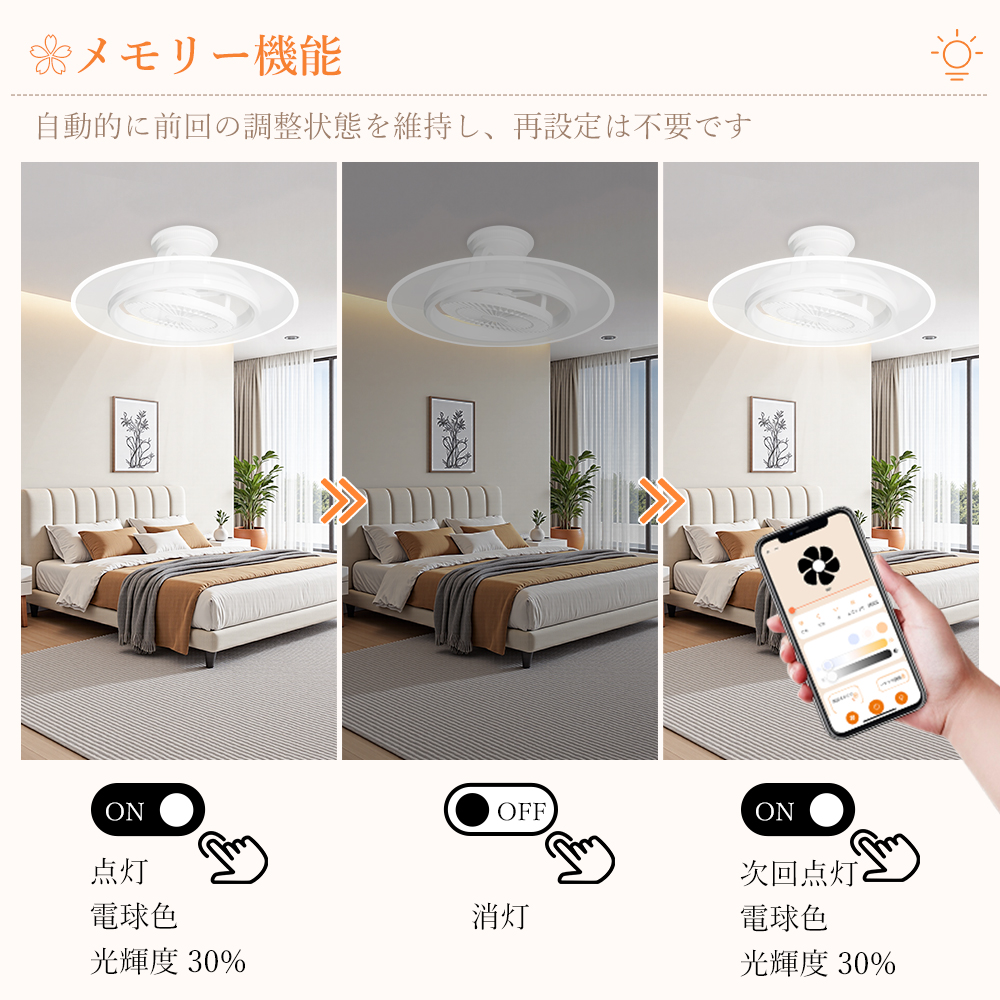 LED シーリングファンライトはファンと照明を一体化し、ライト単独 / ファン単独 / 両方同時作動の 3 モードに対応し、空気循環を促進・温度差を解消し、部屋の隅々まで優しい光とそよ風を届けて快適な空間を演出します。