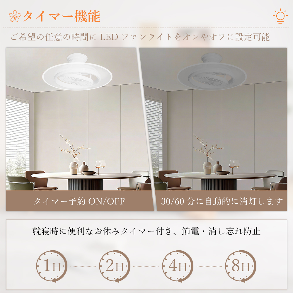 ファンのタイマー機能には「1H」「2H」「4H」「8H」4つモードの設定があり、就寝前や外出前の設定に便利で消し忘れを防ぎます。寝た後に自動消灯を実現できます。睡眠質上がり、電気代も節約できます。
