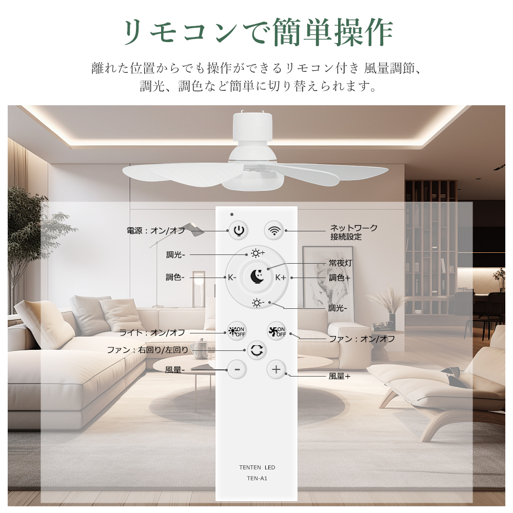 LEDシーリングファンライトをリモコンで簡単で自在にコントロール可能!面倒な電球交換の必要がないLEDモジュールを標準装備する。商品が届いた時点で、すぐにお使い頂けます。安定したLED全光束2200LMの明るさを提供し、省エネで長寿命を実現! リモコンで調光調色ボタンを長押して、電球色、暖白色、昼白色の三色(3500k-6500k)も明るさを10%〜100%も無段階的で楽に切り替えできます。無階段調光を組み合わせると多種類の光を実現!色や明るさが少しずつふわっと変化していくことによって、瞳への刺激も少なく、部屋の心地よい雰囲気を演出できます。