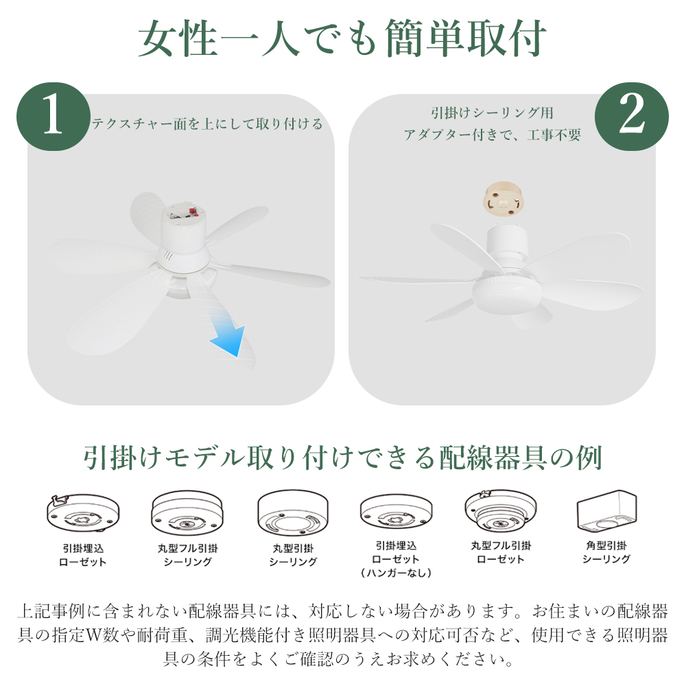 1minかけてファンブレードのテクスチャ面を上にして本体に取り付けるだけで、ランプボディの取り付けが完了します。 次に2 minかけてライト全体をE26ソケットにスイベルマウントします。工事業者に頼まずご自分で取付ける事が可能です。ニーズに応じて角形や丸型引掛シーリングなど多種E26種類の埋め込みローゼットや引掛けシーリングを選べ、本体をそのまま取り付けることが可能になりました。