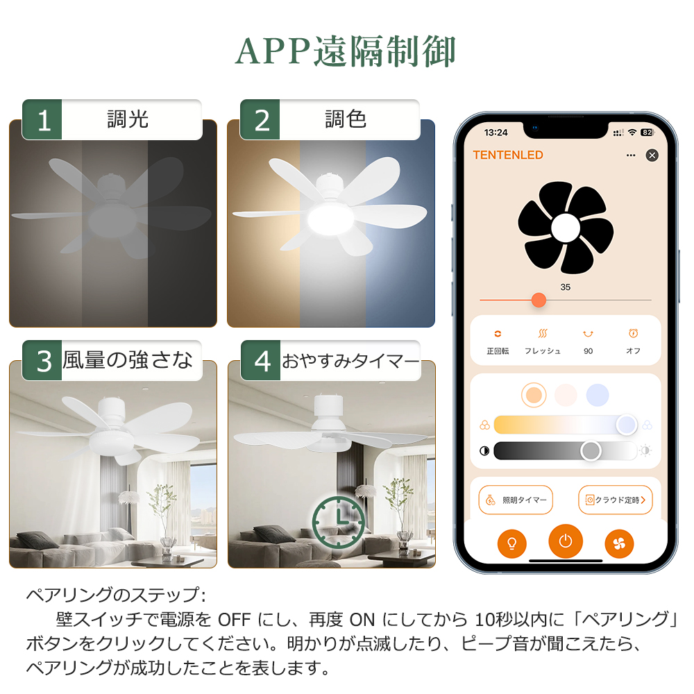 調光?調色はもちろん、お休みタイマ一、風量の強さなど、様々機能を操作可能です。