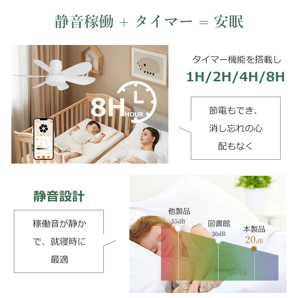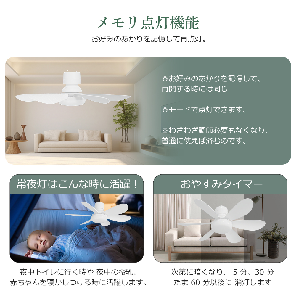 シリングファンライトの裏側に3000k電球色10%輝度の雰囲気ランプを間接照明できます。2H/4H設定が経過すると、LED/ファンの電源が自動で切れます。メモリー機能が搭載されたので、オフする直前の状態が再現されます。リモコンの「常夜灯」スイッチを押すと、低消費電力になります。真っ暗だと眠れない方にも安心の常夜灯付きます。一人寝て始めたばかり子供の部屋また夜間授乳に最適!個人や家族の好みや日常的なニーズに対応可能!