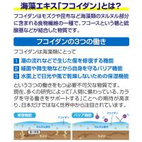 (1)フコイダン(ナノカプセル型):約733mg、(2)フコイダン(通常型):150mg、(3)緑茶抽出物:150mg、(4)長命草:300mgを配合。