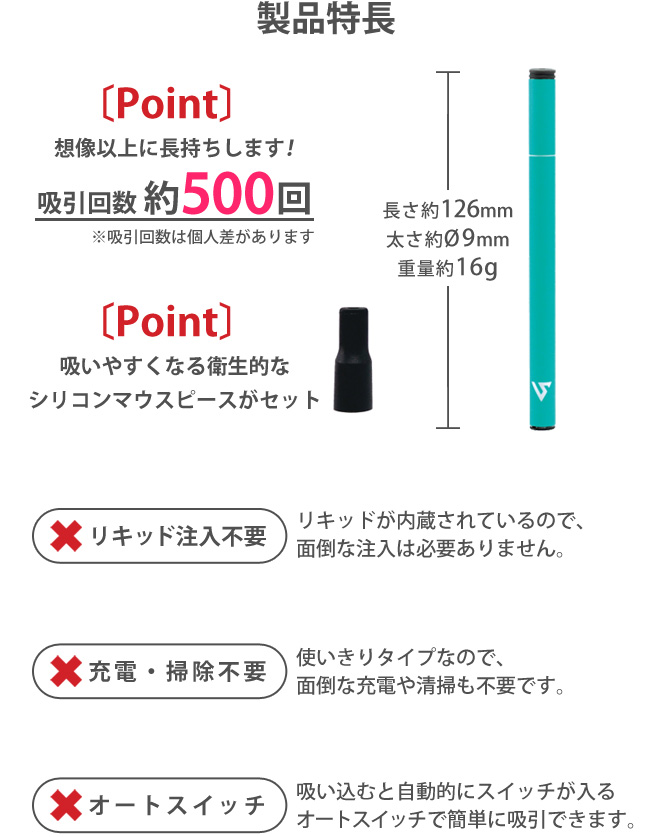 ■サイズ:リキッド入り本体(バッテリー内蔵)約縦126mm×直径9mm、重量約16g
