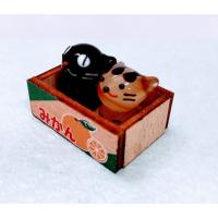 みかん箱ネコクロ/茶トラのガラス細工の置物です。みかん箱は木製です。