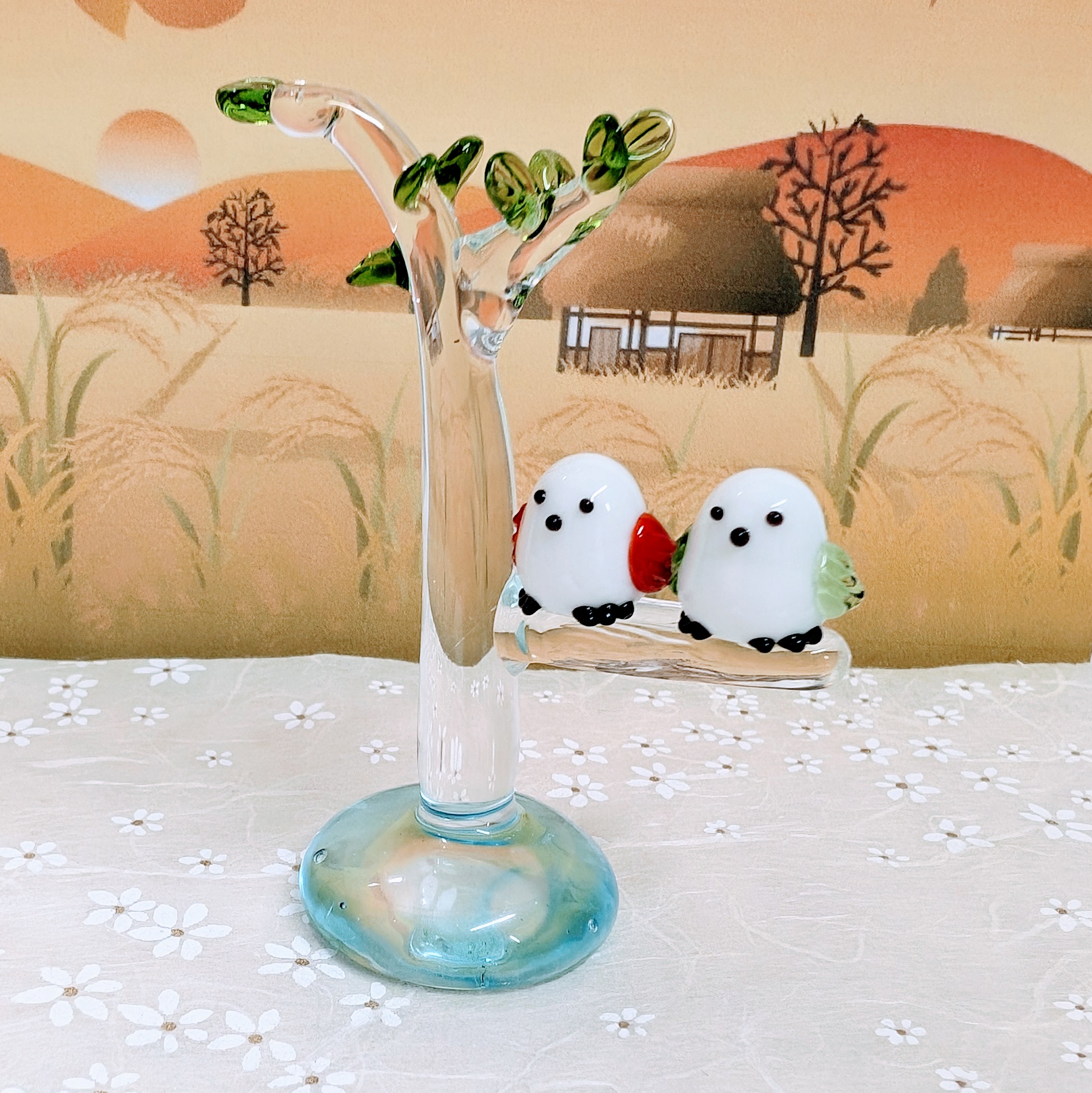 ガラス細工 シマエナガペアと木(クリア)赤/緑 ミニチュア 雑貨 置物 小物 鳥 北海道