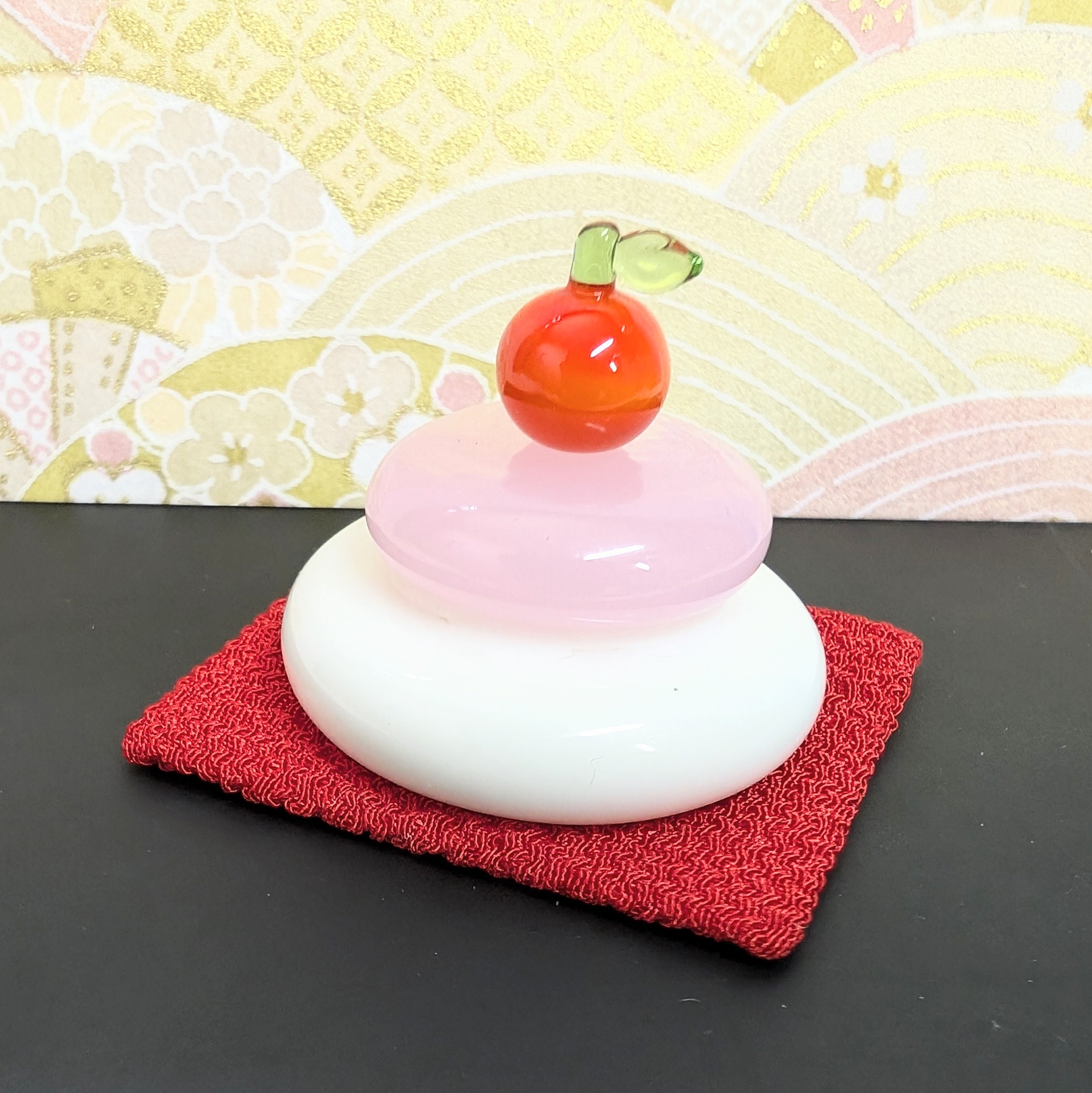 ガラス細工 鏡餅(みかん乗せ)ちりめん台付 ミニチュア 雑貨 置物 小物 お正月