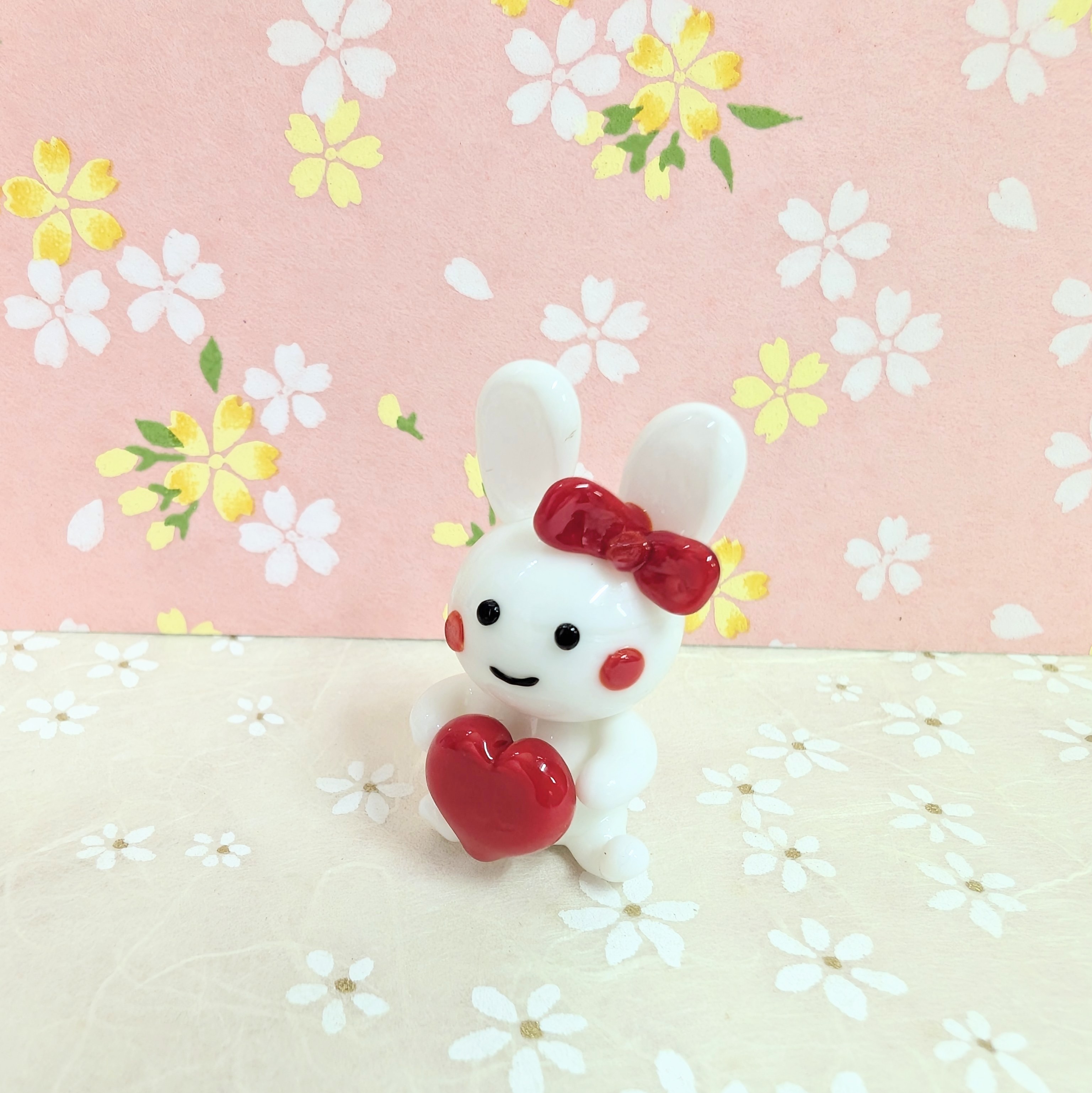 ウサギ(リボン)ハート持ちのガラス細工の置物です。