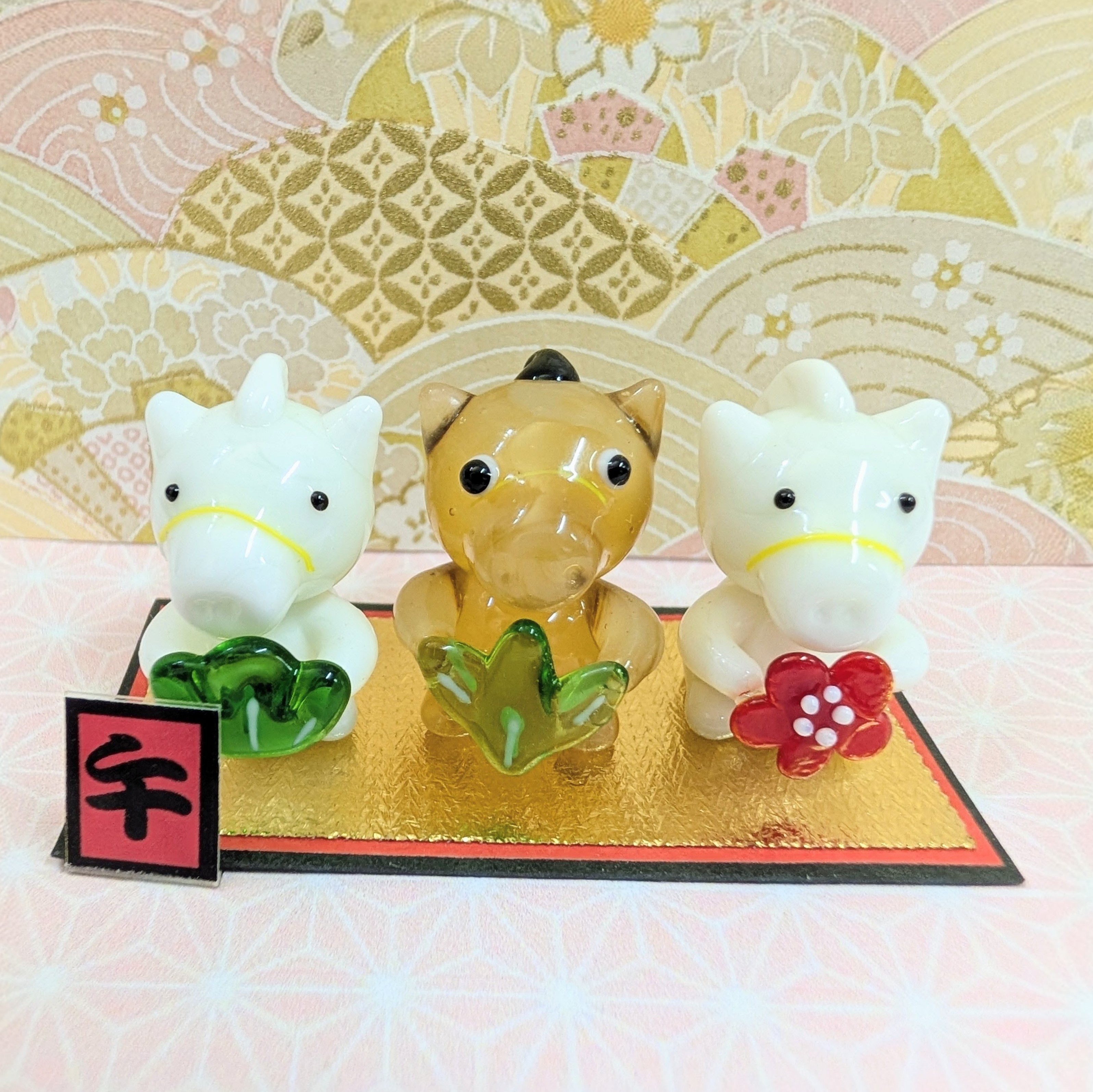 うま松竹梅セットA(台紙、看板付)白/茶/白のガラス細工の置物です。