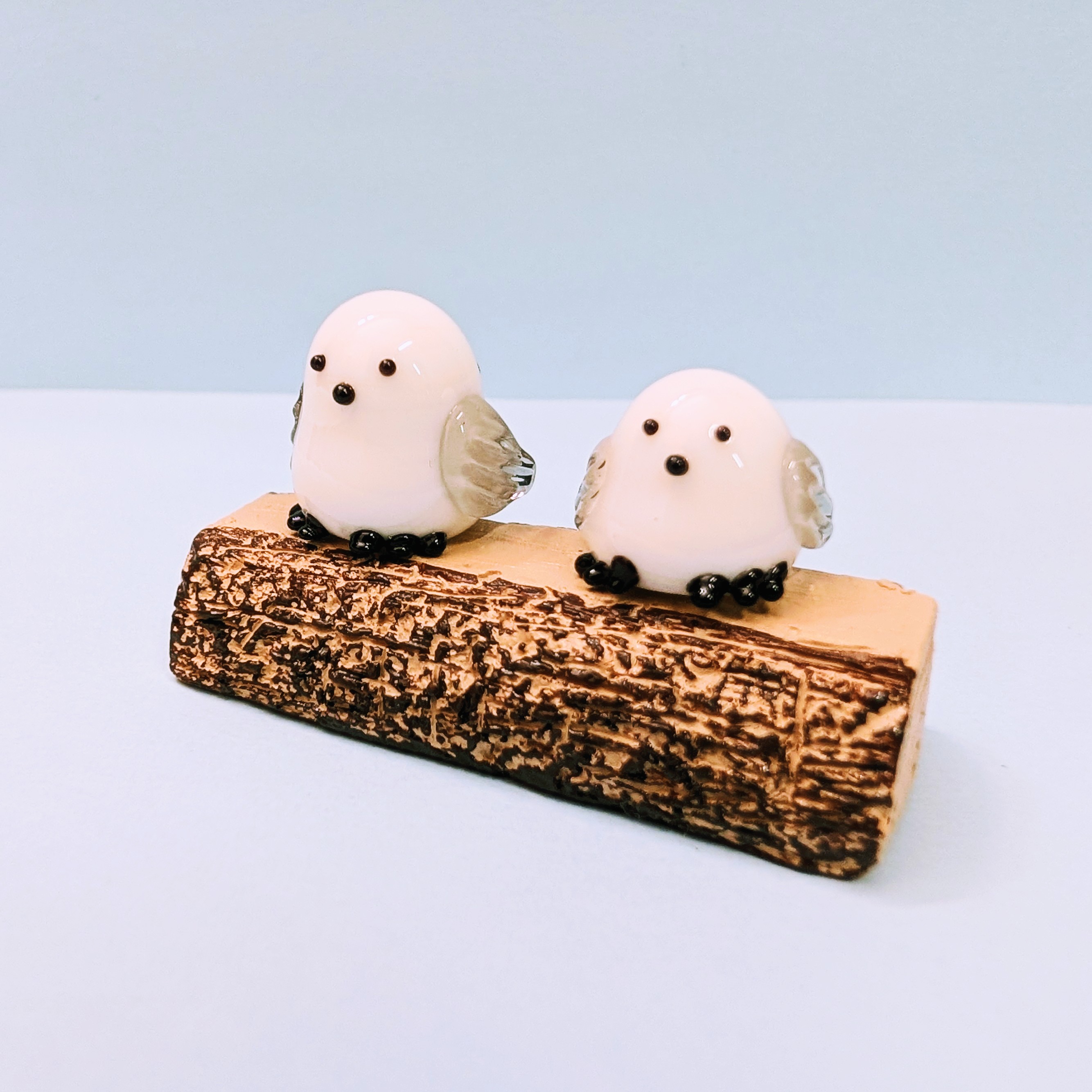 シマエナガ2人ベンチ(木台付)グレーのガラス細工の置物です。木台はポリ製です。