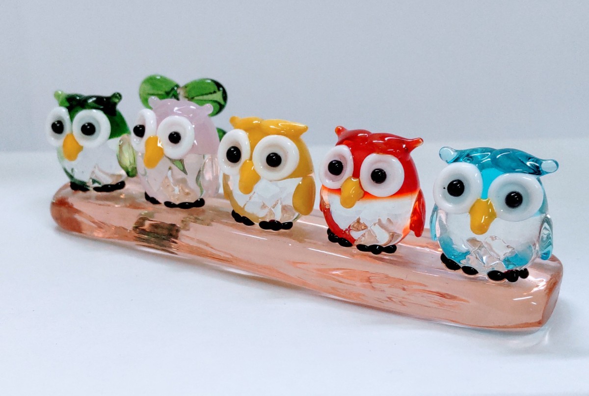 ガラス細工 ふくろう5人ベンチ ミニチュア 置物 梟