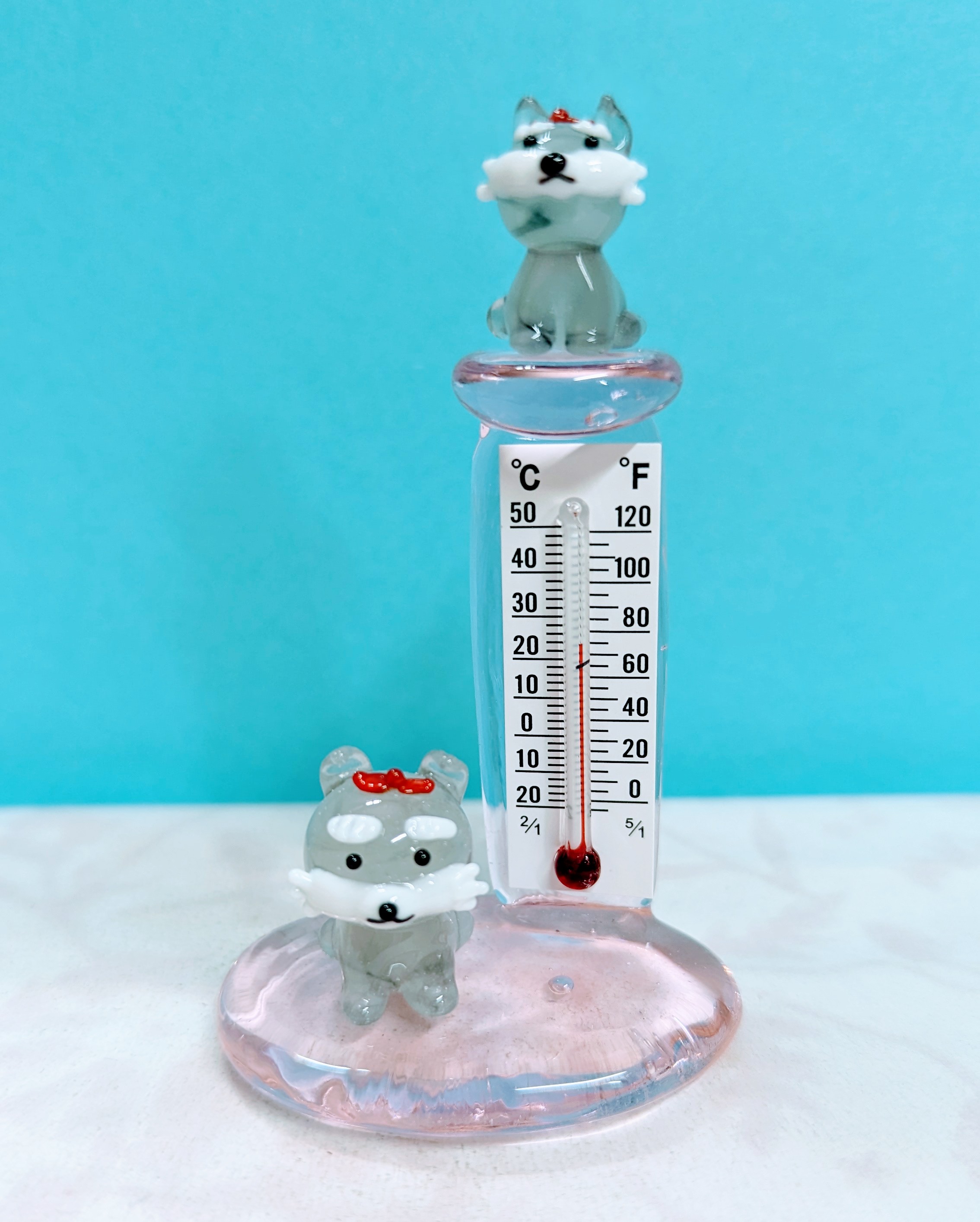 温度計ヨークシャーテリアのガラス細工の置物です。