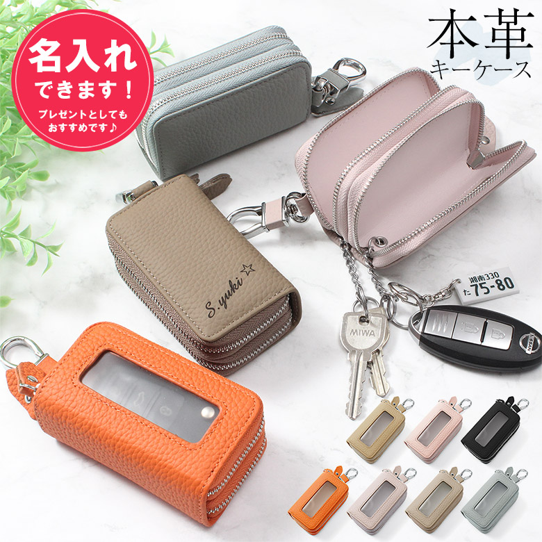 スマートキーケース 2個収納 ダブルファスナー 窓付き キーケース くすみカラー メンズ レディース カード 車 スマートキー 対応 レザー 名入れ 5 爆買